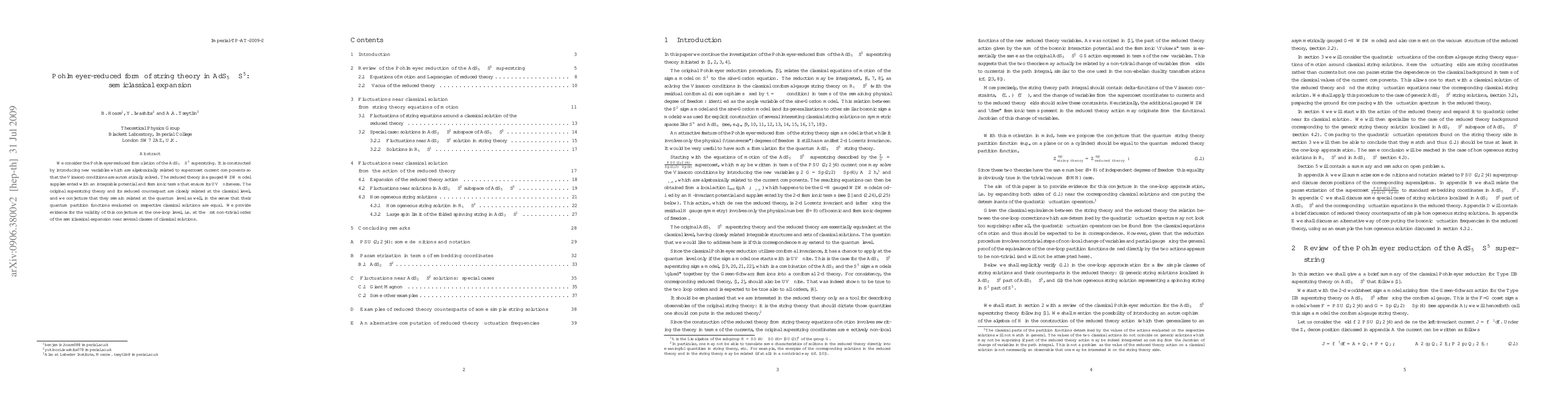 The paper presents a Pohlmeyer-reduced form of the AdS_5 x S^5 superstring theory, which simplifies the Virasoro conditions, and conjectures that the reduced theory retains quantum equivalence to the original theory. Evidence supporting this conjecture is provided through a one-loop semiclassical expansion analysis.