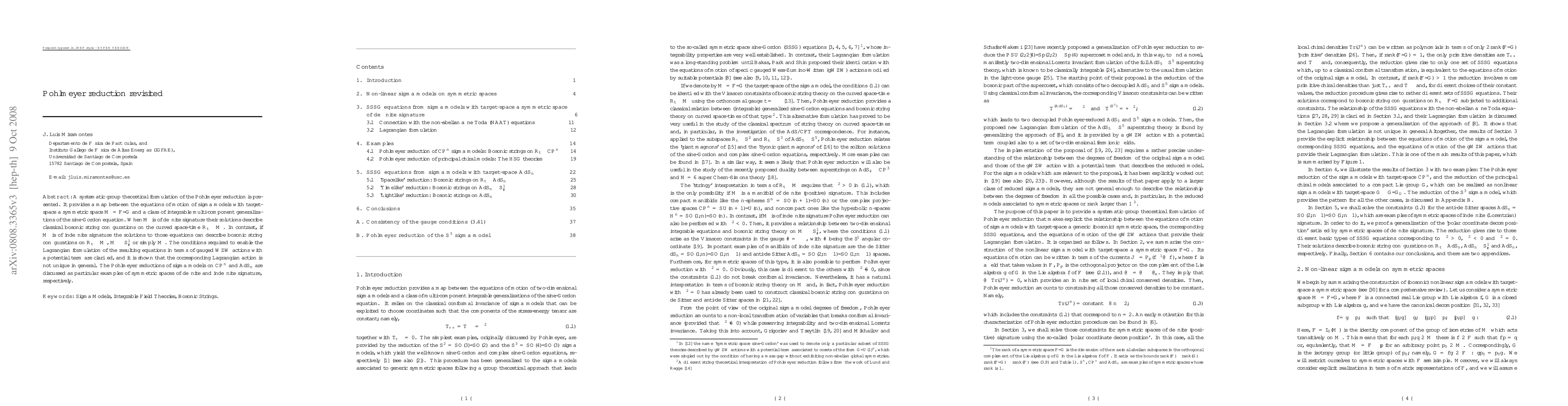 A systematic group theoretical formulation of the Pohlmeyer reduction is presented. It provides a map between the equations of motion of sigma models with target-space a symmetric space M=F/G and a class of integrable multi-component generalizations of the sine-Gordon equation. When M is of definite signature their solutions describe classical bosonic string configurations on the curved space-time R_t\times M. In contrast, if M is of indefinite signature the solutions to those equations can describe bosonic string configurations on R_t\times M, M\times S^1_\vartheta or simply M. The conditions required to enable the Lagrangian formulation of the resulting equations in terms of gauged WZW actions with a potential term are clarified, and it is shown that the corresponding Lagrangian action is not unique in general. The Pohlmeyer reductions of sigma models on CP^n and AdS_n are discussed as particular examples of symmetric spaces of definite and indefinite signature, respectively.