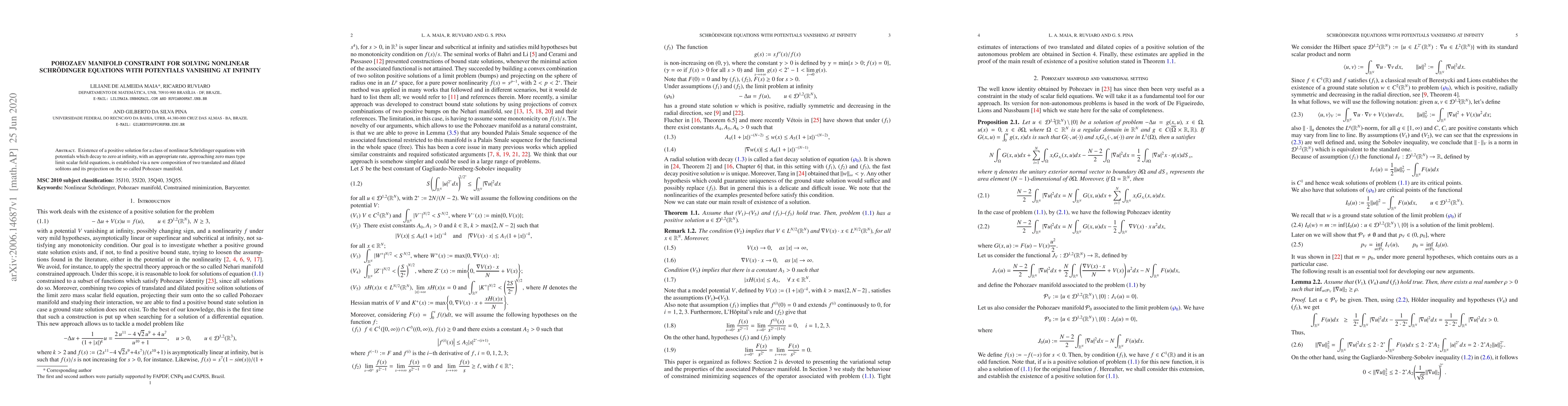 The paper establishes the existence of a positive solution for nonlinear Schrödinger equations with vanishing potentials using a combination of translated and dilated solitons projected onto the Pohozaev manifold. This approach achieves a zero mass limit for scalar field equations.
