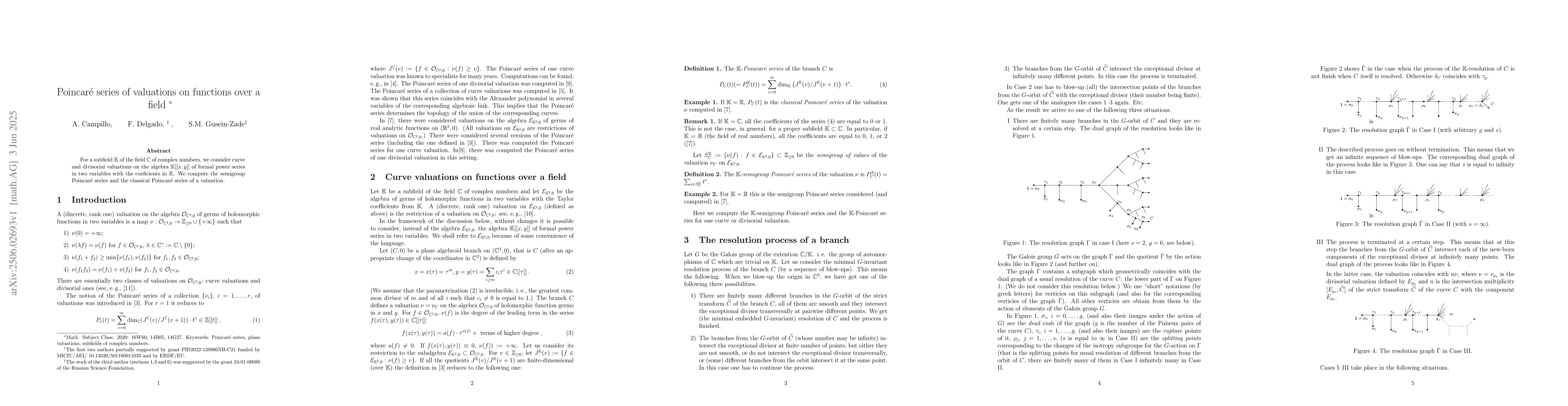 The research focuses on curve and divisorial valuations on the algebra K[[x,y]] of formal power series in two variables with coefficients in a subfield K of the complex numbers C. It computes the semigroup Poincaré series and the classical Poincaré series of a valuation.