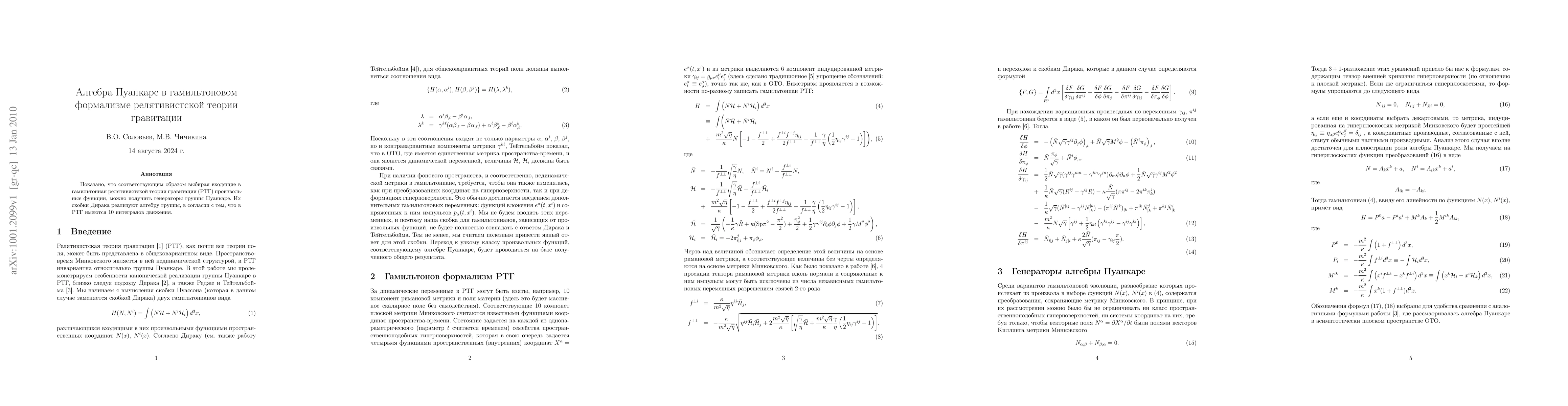 Summary: This paper derives the Poincare group generators from the Hamiltonian formalism of the Relativistic Theory of Gravitation (RTG) by selecting specific arbitrary functions, and their Dirac brackets confirm the Poincare algebra, leveraging RTG's 10 conserved quantities.