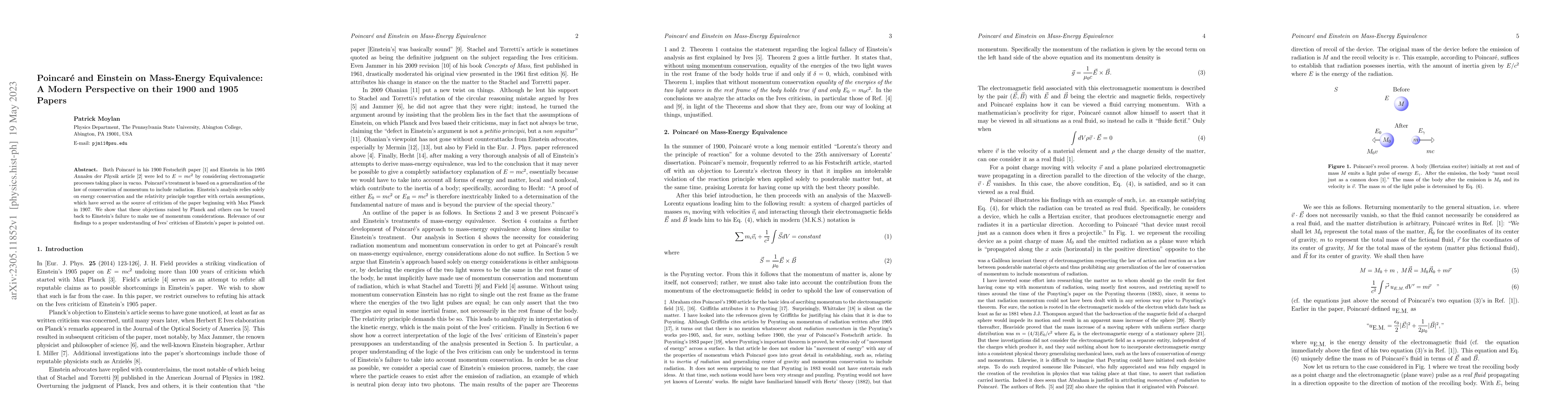 This paper compares Poincaré's and Einstein's derivations of the mass-energy equivalence principle, highlighting Poincaré's broader consideration of momentum conservation versus Einstein's reliance on energy conservation and the relativity principle. It argues that Einstein's omissions led to early criticisms, particularly from Planck, and clarifies the relevance to Ives' later critique.