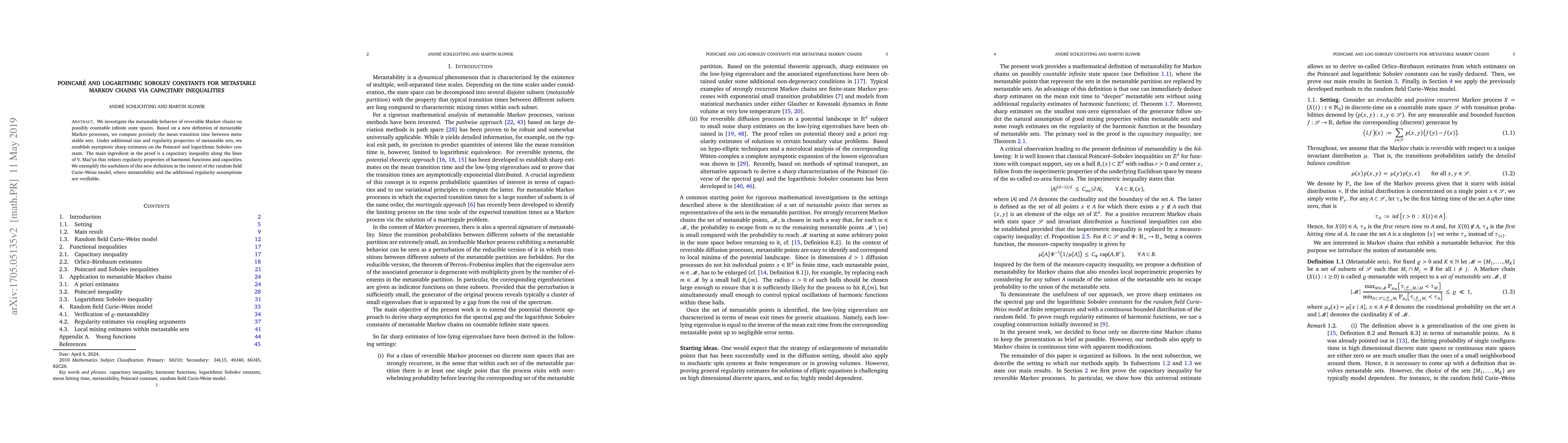 This paper studies the metastable behavior of reversible Markov chains, defining new metastable Markov processes and computing transition times between metastable sets. It establishes sharp estimates for Poincar\'e and logarithmic Sobolev constants using a capacitary inequality, exemplified in the random field Curie-Weiss model.