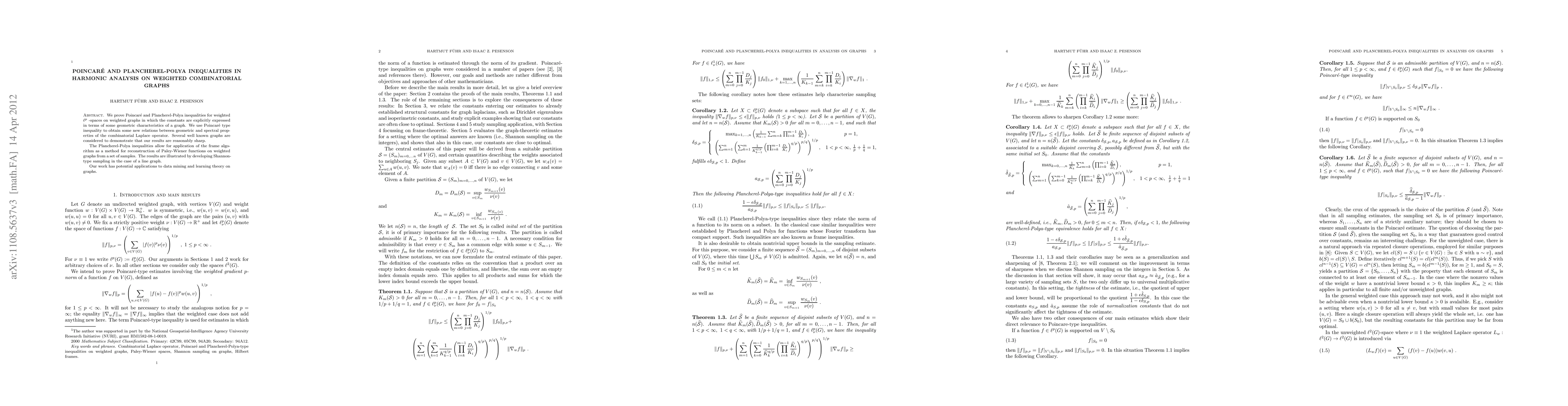 This paper proves Poincaré and Plancherel-Polya inequalities for weighted combinatorial graphs, deriving explicit constants based on geometric graph characteristics. It explores applications in data mining and learning theory by linking geometric and spectral properties of the combinatorial Laplace operator and demonstrates reconstruction methods for Paley-Wiener functions on weighted graphs.