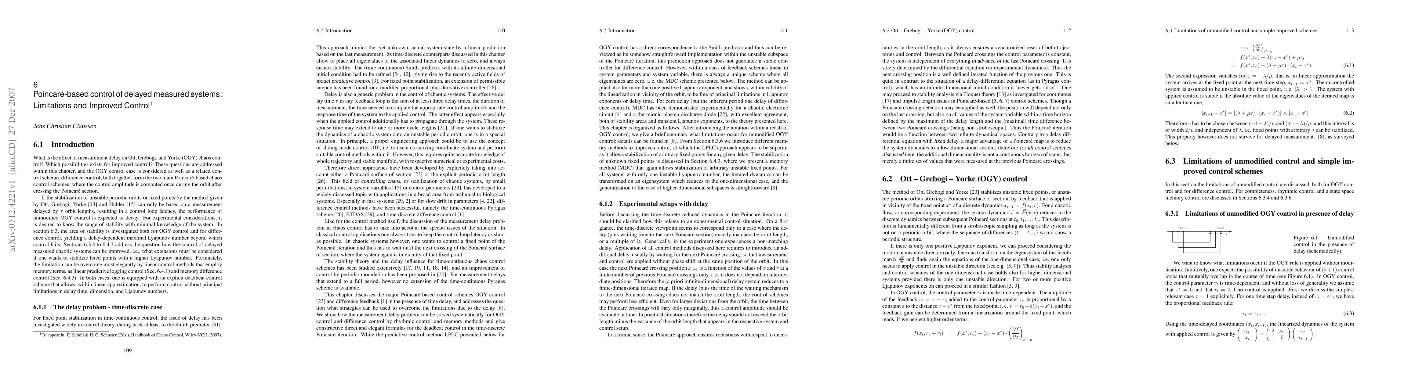 When a chaotic system is to be stabilized to a unstable orbit, delayed measurement of the system limits the applicability of chaos control techniqes. These limitations are analyzed and control schemes as linear predictive logging control (LPLC) and memory difference control (MDC) are introduced which can overcome those limitations for chaos control schemes that act in the Poincar\'{e} section as Ott-Grebogi-Yorke (OGY) control and Bielawski-Derozier_Glorieux control (difference control).