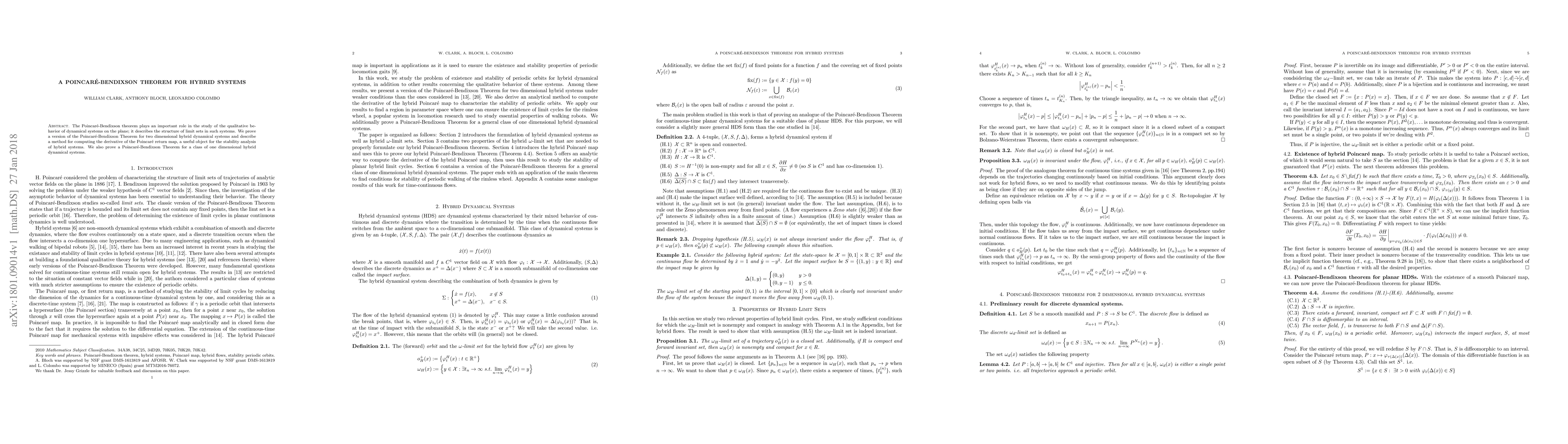 This paper extends the Poincaré-Bendixson theorem to two-dimensional hybrid dynamical systems, providing a method for computing the derivative of the Poincaré return map for stability analysis. It also proves a version of the theorem for one-dimensional hybrid systems.