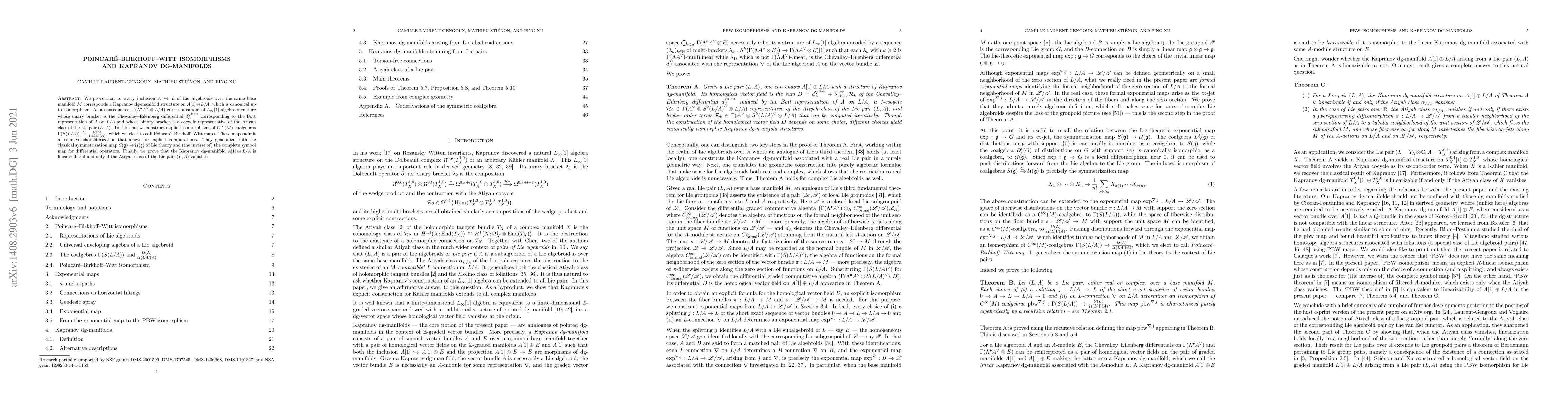 We prove that to every inclusion $A\hookrightarrow L$ of Lie algebroids over the same base manifold $M$ corresponds a Kapranov dg-manifold structure on $A[1]\oplus L/A$, which is canonical up to isomorphism. As a consequence, $\Gamma(\Lambda^\bullet A^\vee\otimes L/A)$ carries a canonical $L_\infty[1]$ algebra structure whose unary bracket is the Chevalley--Eilenberg differential corresponding to the Bott representation of $A$ on $L/A$ and whose binary bracket is a cocycle representative of the Atiyah class of the Lie pair $(L,A)$. To this end, we construct explicit isomorphisms of $C^\infty(M)$-coalgebras $\Gamma\big(S(L/A)\big)\xrightarrow{\sim}\frac{\mathcal{U}(L)}{\mathcal{U}(L)\Gamma(A)}$, which we elect to call Poincar\'e--Birkhoff--Witt maps. These maps admit a recursive characterization that allows for explicit computations. They generalize both the classical symmetrization map $S(\mathfrak{g})\to\mathcal{U}(\mathfrak{g})$ of Lie theory and (the inverse of) the complete symbol map for differential operators. Finally, we prove that the Kapranov dg-manifold $A[1]\oplus L/A$ is linearizable if and only if the Atiyah class of the Lie pair $(L,A)$ vanishes.