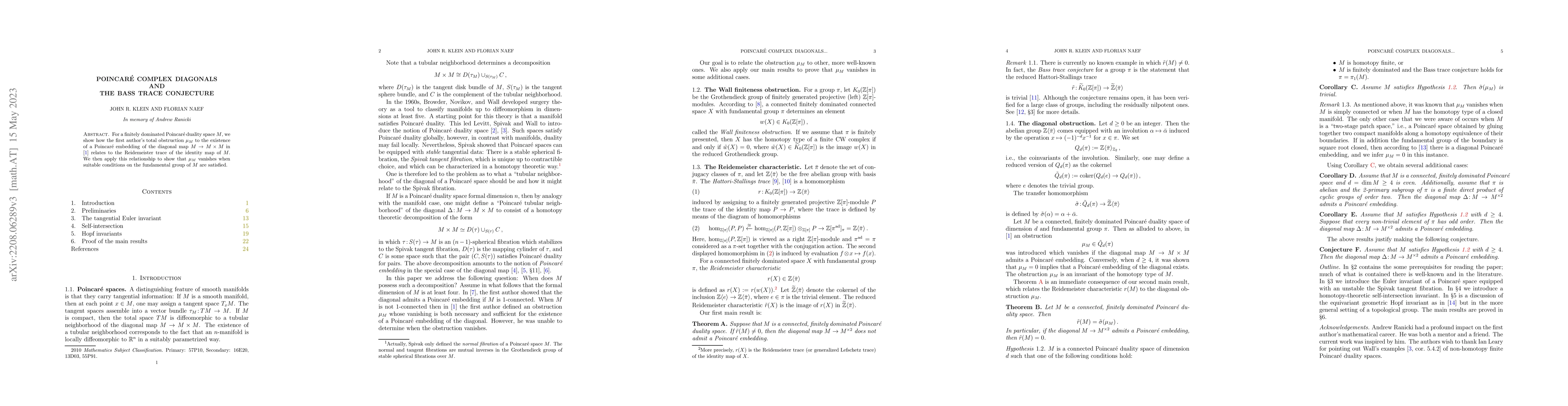 For a finitely dominated Poincar\'e duality space $M$, we show how the author's total obstruction to the existence of a Poincar\'e embedding of the diagonal map $M \to M \times M$ relates to the Reidemeister trace of the identity map of $M$. We also show that if the dimension of $M$ is even and at least four, and if $\pi_1(M)$ is a finite direct product of cyclic groups of order two, then the diagonal map admits a Poincar\'e embedding.