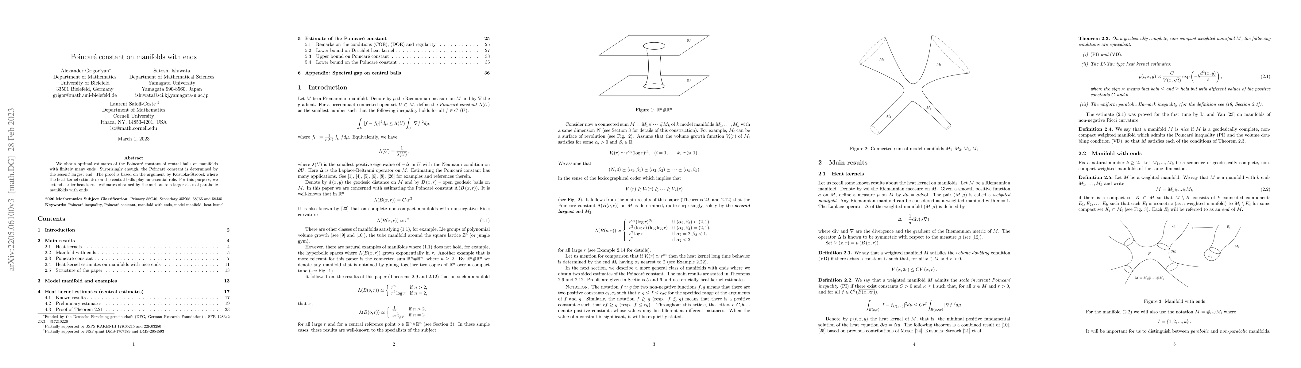 We obtain optimal estimates of the Poincar\'e constant of central balls on manifolds with finitely many ends. Surprisingly enough, the Poincar\'e constant is determined by the second largest end. The proof is based on the argument by Kusuoka-Stroock where the heat kernel estimates on the central balls play an essential role. For this purpose, we extend earlier heat kernel estimates obtained by the authors to a larger class of parabolic manifolds with ends.