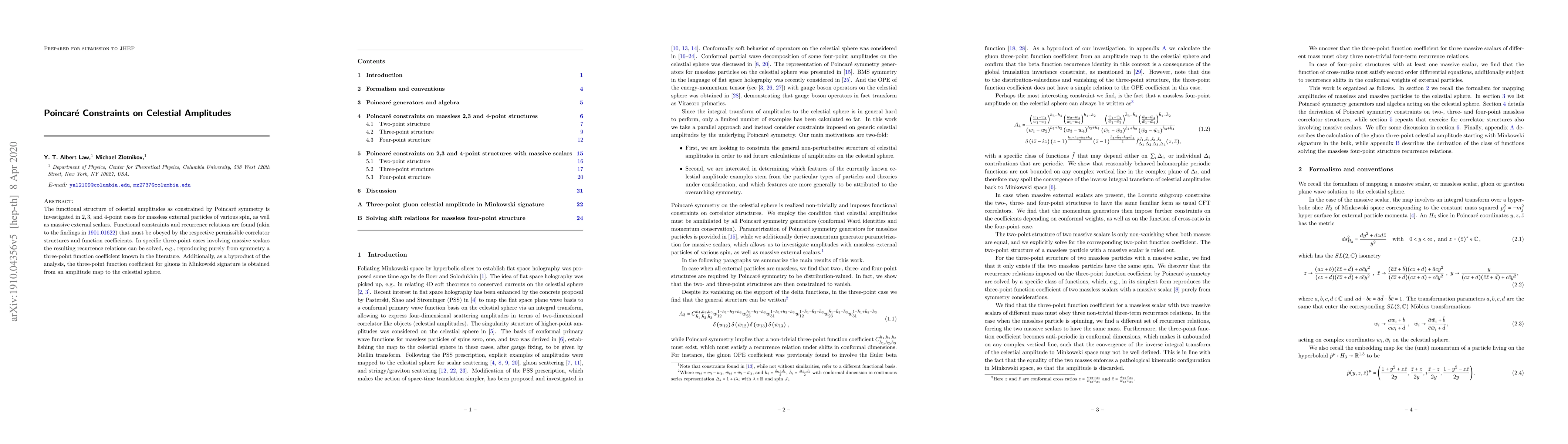 Researchers investigated how Poincaré symmetry constraints celestial amplitudes in particle physics, finding functional structures and recurrence relations that govern the behavior of these amplitudes.