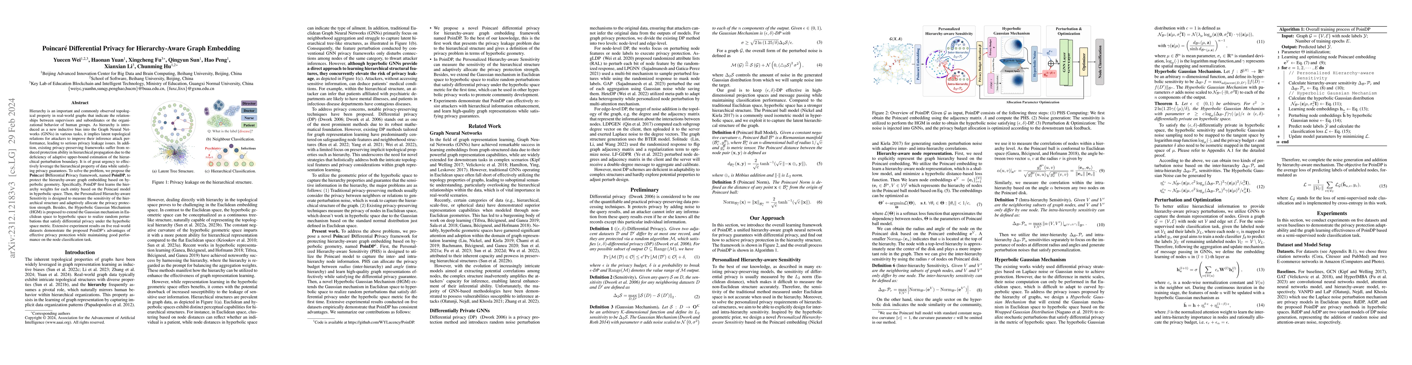 This paper proposes PoinDP, a Poincar\'e Differential Privacy framework that leverages hyperbolic geometry to protect hierarchy-aware graph embedding. It introduces a Personalized Hierarchy-aware Sensitivity and a Hyperbolic Gaussian Mechanism to ensure adaptive privacy protection while maintaining performance on node classification tasks.