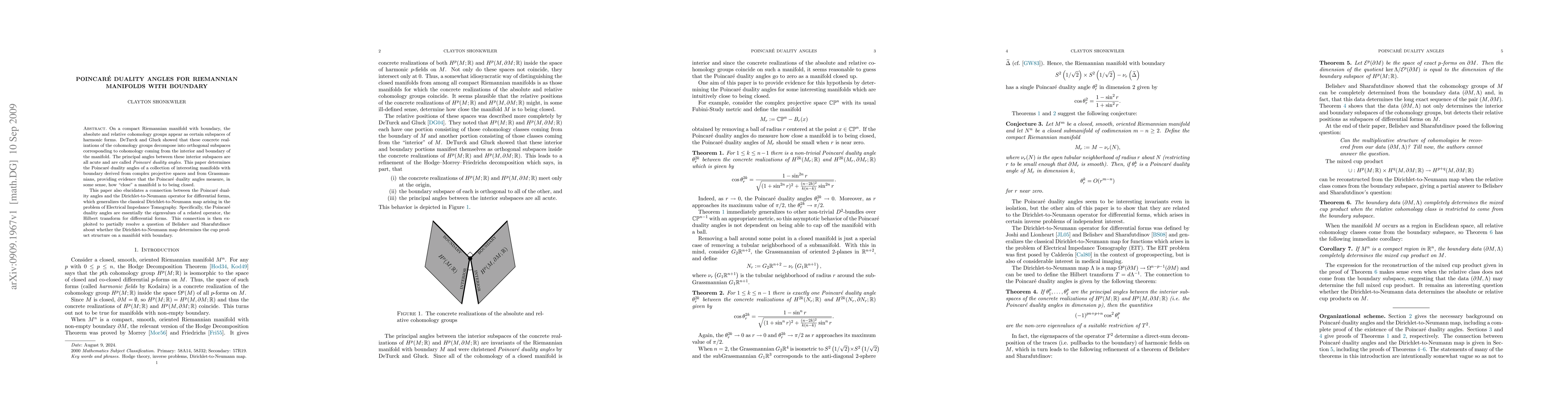On a compact Riemannian manifold with boundary, the absolute and relative cohomology groups appear as certain subspaces of harmonic forms. DeTurck and Gluck showed that these concrete realizations of the cohomology groups decompose into orthogonal subspaces corresponding to cohomology coming from the interior and boundary of the manifold. The principal angles between these interior subspaces are all acute and are called Poincare duality angles. This paper determines the Poincare duality angles of a collection of interesting manifolds with boundary derived from complex projective spaces and from Grassmannians, providing evidence that the Poincare duality angles measure, in some sense, how "close" a manifold is to being closed. This paper also elucidates a connection between the Poincare duality angles and the Dirichlet-to-Neumann operator for differential forms, which generalizes the classical Dirichlet-to-Neumann map arising in the problem of Electrical Impedance Tomography. Specifically, the Poincare duality angles are essentially the eigenvalues of a related operator, the Hilbert transform for differential forms. This connection is then exploited to partially resolve a question of Belishev and Sharafutdinov about whether the Dirichlet-to-Neumann map determines the cup product structure on a manifold with boundary.
