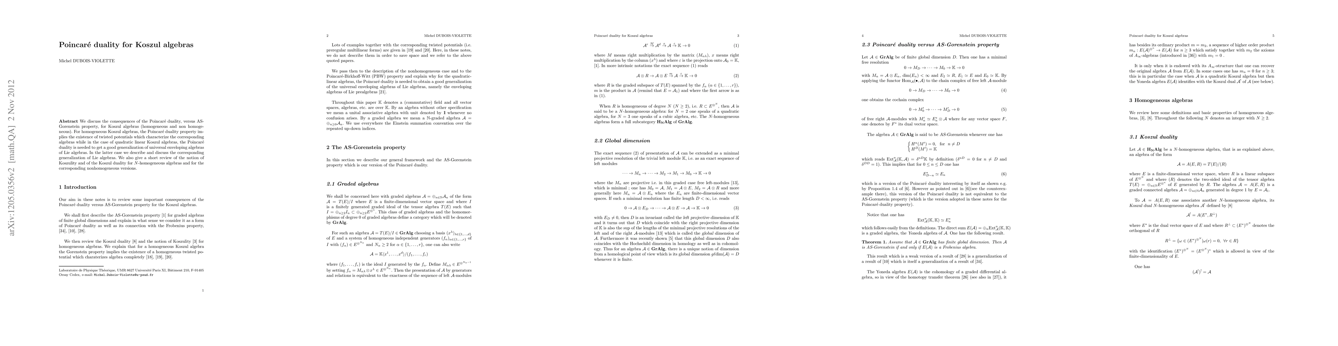 We discuss the consequences of the Poincar\'e duality, versus AS- Gorenstein property, for Koszul algebras (homogeneous and non homogeneous). For homogeneous Koszul algebras, the Poincar\'e duality property implies the existence of twisted potentials which characterize the corresponding algebras while in the case of quadratic linear Koszul algebras, the Poincar\'e duality is needed to get a good generalization of universal enveloping algebras of Lie algebras. In the latter case we describe and discuss the corresponding generalization of Lie algebras. We also give a short review of the notion of Koszulity and of the Koszul duality for N-homogeneous algebras and for the corresponding nonhomogeneous versions.