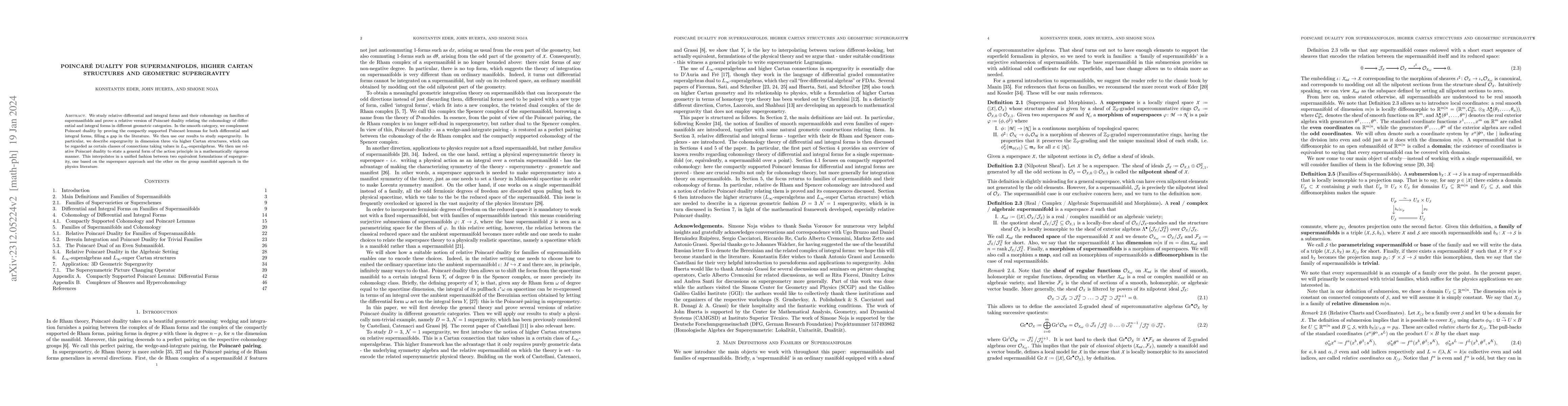 This paper establishes a relative version of Poincaré duality for supermanifolds, complements it with compactly supported Poincaré lemmas, and applies these results to develop a mathematically rigorous framework for three-dimensional supergravity using higher Cartan structures and an action principle.