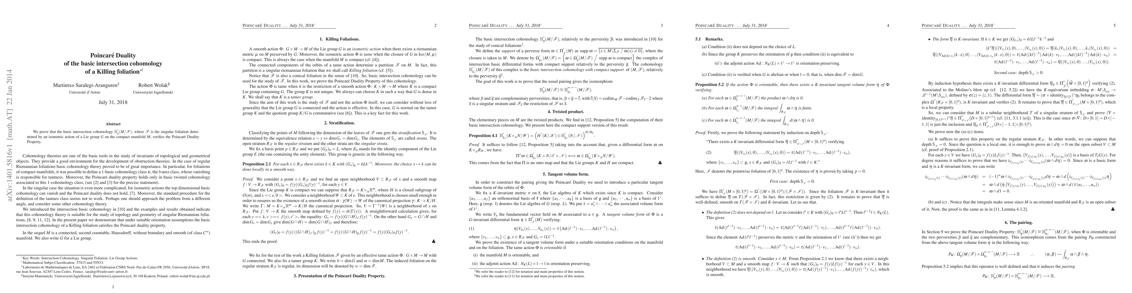 We prove that the basic intersection cohomology $IH^*_{\overline{p}}(M / \mathcal{F})$, where $\mathcal{F}$ is the singular foliation determined by an isometric action of a Lie group $G$ on the compact manifold $M$, verifies the Poincar\'e Duality Property.
