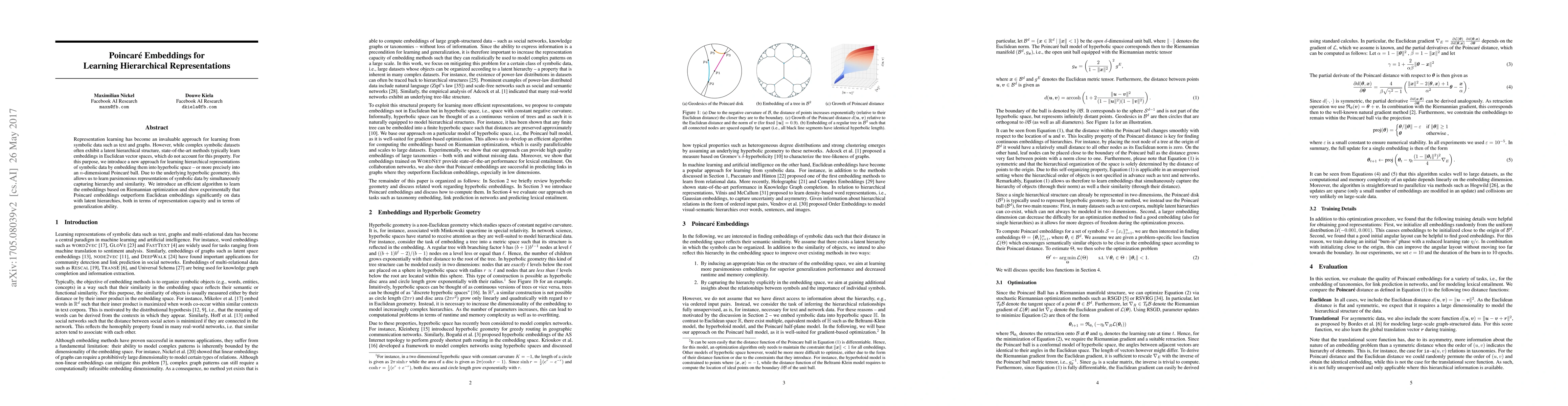 Representation learning has become an invaluable approach for learning from symbolic data such as text and graphs. However, while complex symbolic datasets often exhibit a latent hierarchical structure, state-of-the-art methods typically learn embeddings in Euclidean vector spaces, which do not account for this property. For this purpose, we introduce a new approach for learning hierarchical representations of symbolic data by embedding them into hyperbolic space -- or more precisely into an n-dimensional Poincar\'e ball. Due to the underlying hyperbolic geometry, this allows us to learn parsimonious representations of symbolic data by simultaneously capturing hierarchy and similarity. We introduce an efficient algorithm to learn the embeddings based on Riemannian optimization and show experimentally that Poincar\'e embeddings outperform Euclidean embeddings significantly on data with latent hierarchies, both in terms of representation capacity and in terms of generalization ability.