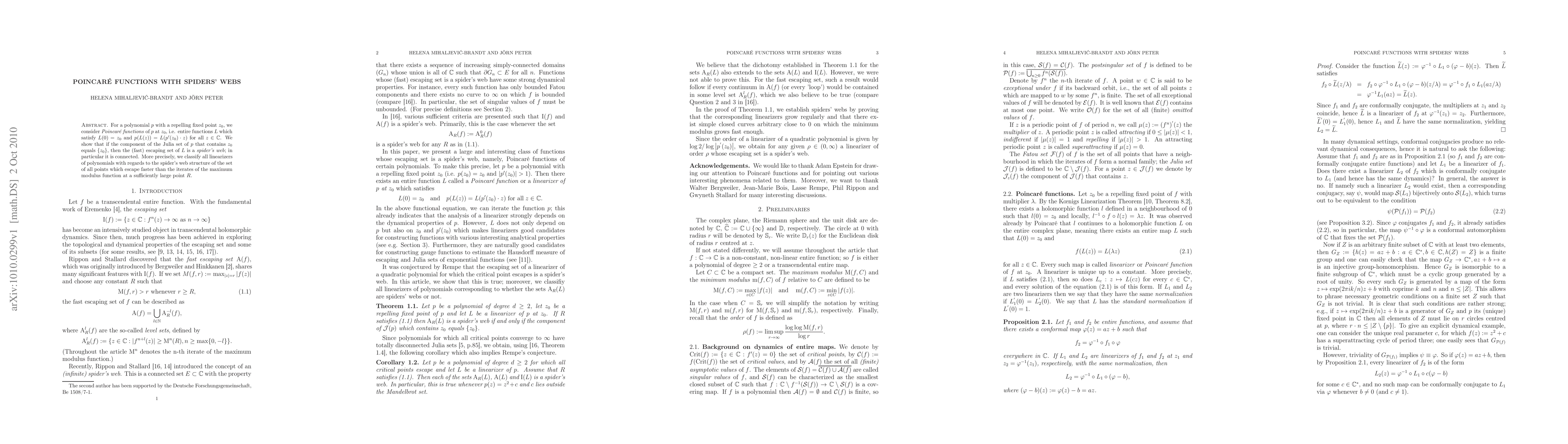 This paper explores Poincaré functions for polynomials with repelling fixed points, demonstrating that when the Julia set component containing the fixed point is a singleton, the escaping set of these functions forms a connected "spider's web." It classifies linearizers based on the spider's web structure of points escaping faster than the maximum modulus function.
