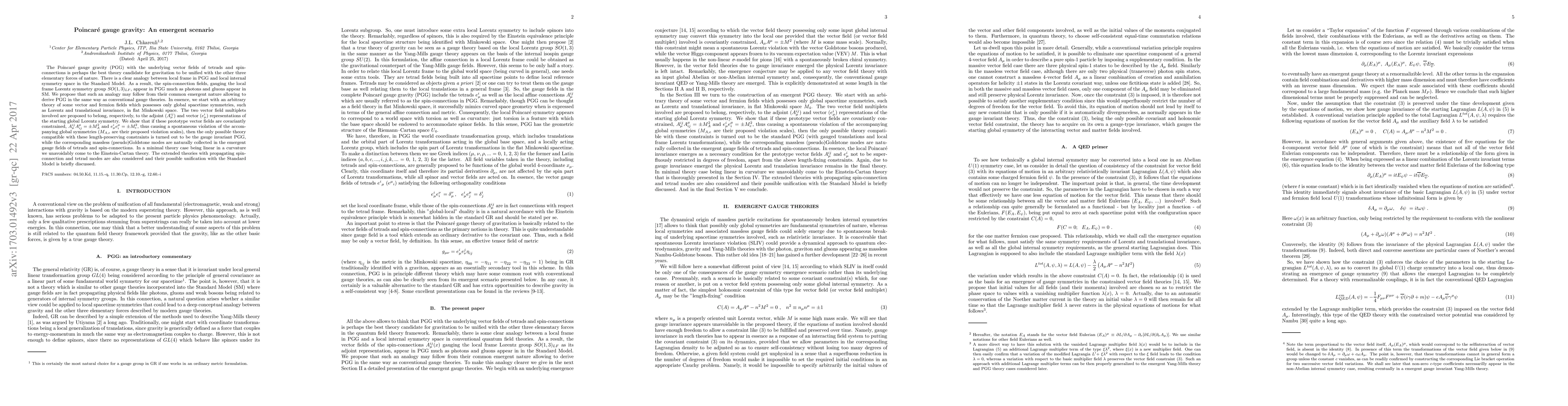 The paper proposes Poincaré gauge gravity (PGG) as a unifying theory for gravity and the Standard Model, leveraging an analogy between PGG’s local frame symmetry and the internal symmetry space in the Standard Model. It demonstrates that starting from an arbitrary global Lorentz invariant theory in flat space, the spontaneous violation of global symmetries through covariant constraints leads to the emergence of PGG with tetrads and spin-connections.