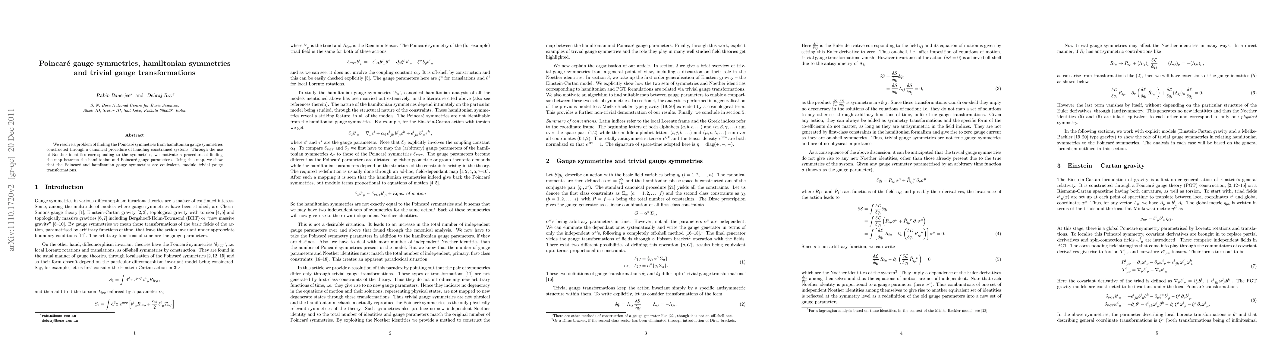 We resolve a problem of finding the Poincare symmetries from hamiltonian gauge symmetries constructed through a canonical procedure of handling constrained systems. Through the use of Noether identities corresponding to the symmetries, we motivate a procedure of finding the map between the hamiltonian and Poincare gauge parameters. Using this map, we show that the Poincare and hamiltonian gauge symmetries are equivalent, modulo trivial gauge transformations.