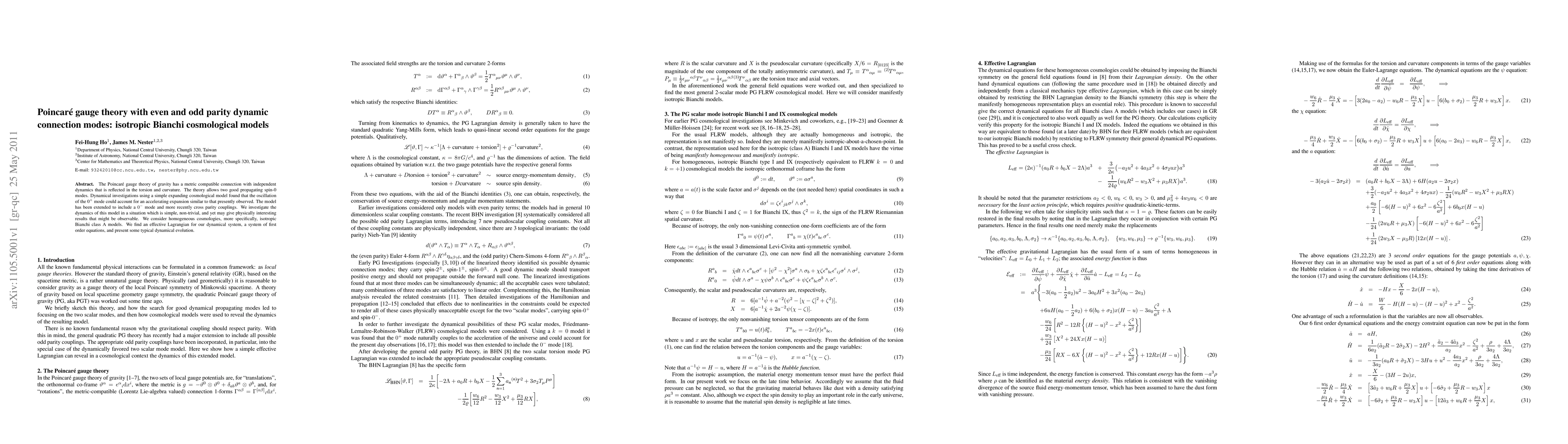 The Poincar\'e gauge theory of gravity has a metric compatible connection with independent dynamics that is reflected in the torsion and curvature. The theory allows two good propagating spin-0 modes. Dynamical investigations using a simple expanding cosmological model found that the oscillation of the 0$^+$ mode could account for an accelerating expansion similar to that presently observed. The model has been extended to include a $0^{-}$ mode and more recently cross parity couplings. We investigate the dynamics of this model in a situation which is simple, non-trivial, and yet may give physically interesting results that might be observable. We consider homogeneous cosmologies, more specifically, isotropic Bianchi class A models. We find an effective Lagrangian for our dynamical system, a system of first order equations, and present some typical dynamical evolution.