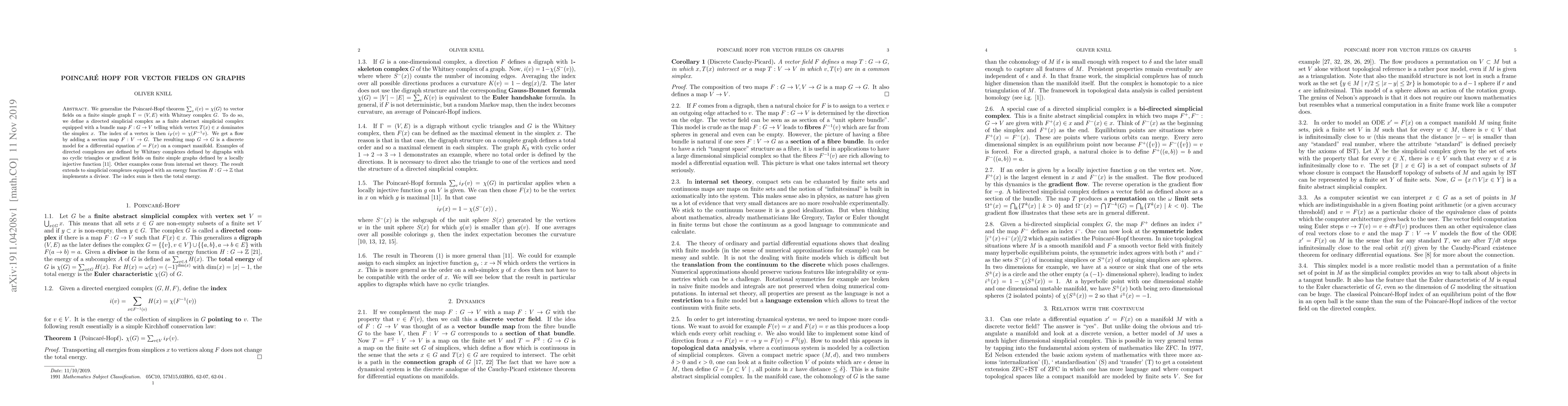 We generalize the Poincare-Hopf theorem sum_v i(v) = X(G) to vector fields on a finite simple graph (V,E) with Whitney complex G. To do so, we define a directed simplicial complex as a finite abstract simplicial complex equipped with a bundle map F: G to V telling which vertex T(x) in x dominates the simplex x. The index i(v) of a vertex v is defined as X(F^-1(v)), where X is the Euler characteristic. We get a flow by adding a section map F: V to G. The resulting map T on G is a discrete model for a differential equation x'=F(x) on a compact manifold. Examples of directed complexes are defined by Whitney complexes defined by digraphs with no cyclic triangles or gradient fields on finite simple graphs defined by a locally injective function. The result extends to simplicial complexes equipped with an energy function H:G to Z that implements a divisor. The index sum is then the total energy.