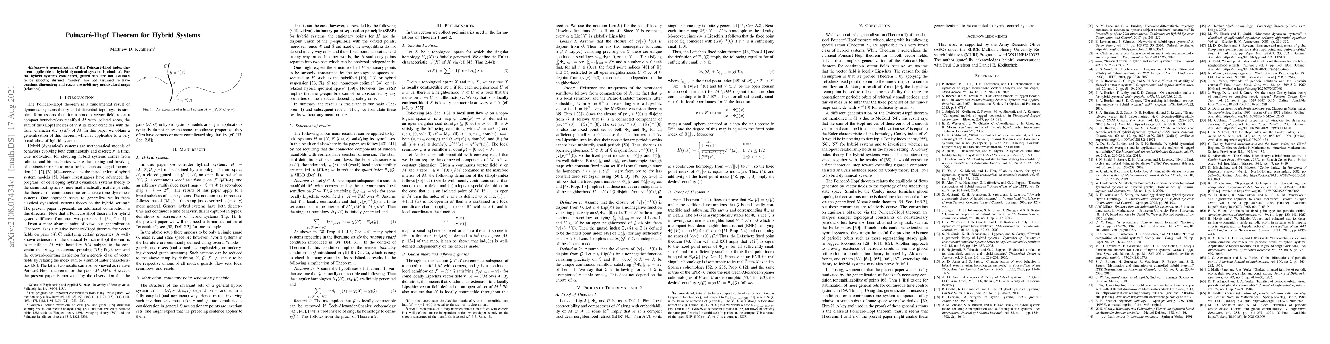 Summary: This paper generalizes the Poincaré-Hopf theorem to hybrid dynamical systems, accommodating non-smooth guard sets, variable-dimension modes, and arbitrary multivalued resets. The result provides a robust index theorem for analyzing the topological behavior of such systems.