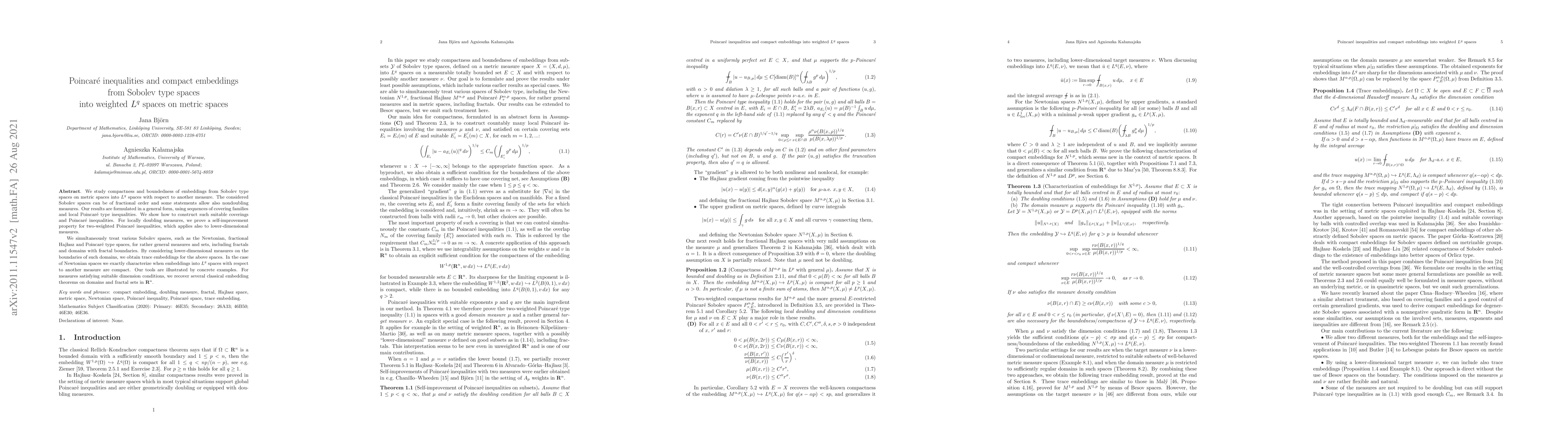 This paper studies the compactness and boundedness of embeddings from various Sobolev spaces on metric spaces into weighted $L^q$ spaces using local Poincaré inequalities. It characterizes when embeddings into $L^q$ spaces with respect to another measure are compact, especially for Newtonian spaces, and recovers classical embedding theorems for certain dimension conditions.