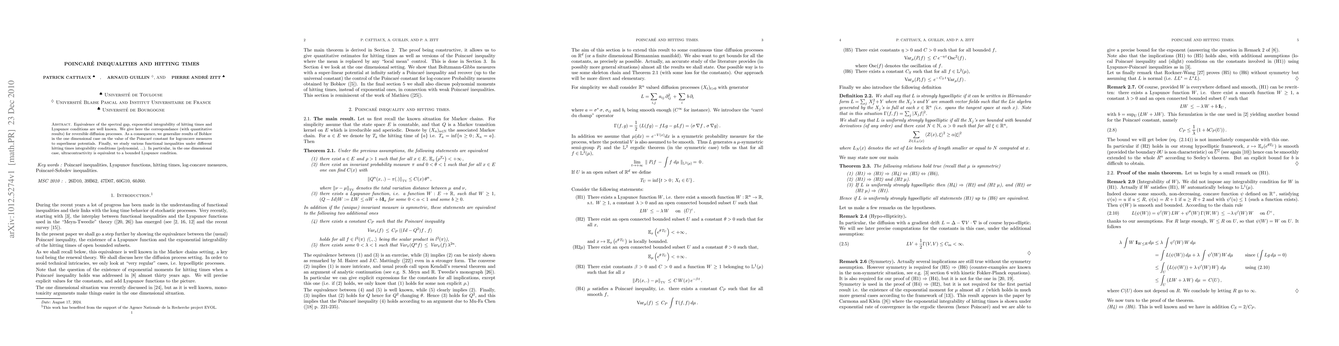 This paper establishes quantitative relationships between the spectral gap, exponential integrability of hitting times, and Lyapunov conditions for reversible diffusion processes. It generalizes Bobkov's results on Poincaré constants for logconcave measures to superlinear potentials and explores various functional inequalities under different hitting times integrability conditions.