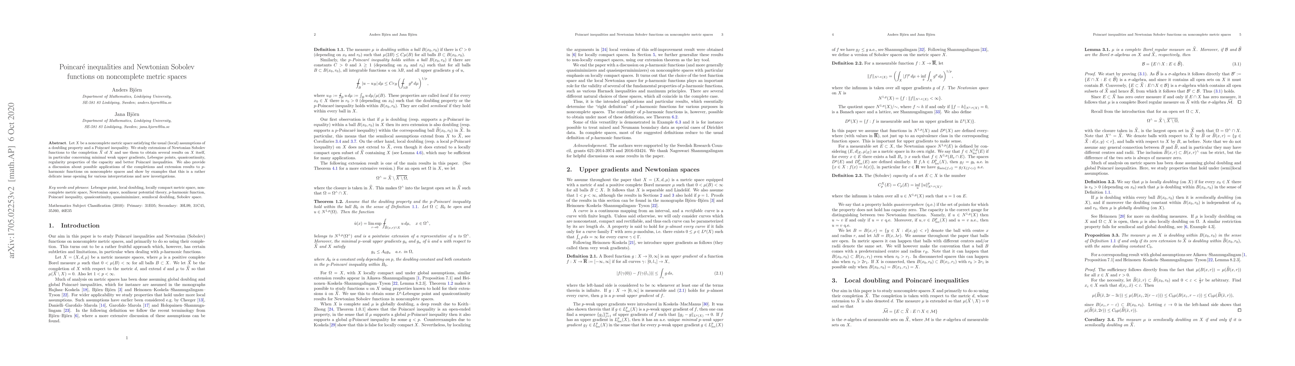 This paper explores extensions of Newtonian Sobolev functions on noncomplete metric spaces with doubling properties and Poincaré inequalities to their completions, deriving results on minimal weak upper gradients, Lebesgue points, and quasicontinuity. It also discusses applications to $p$-harmonic functions, highlighting the complexity and potential for further research.