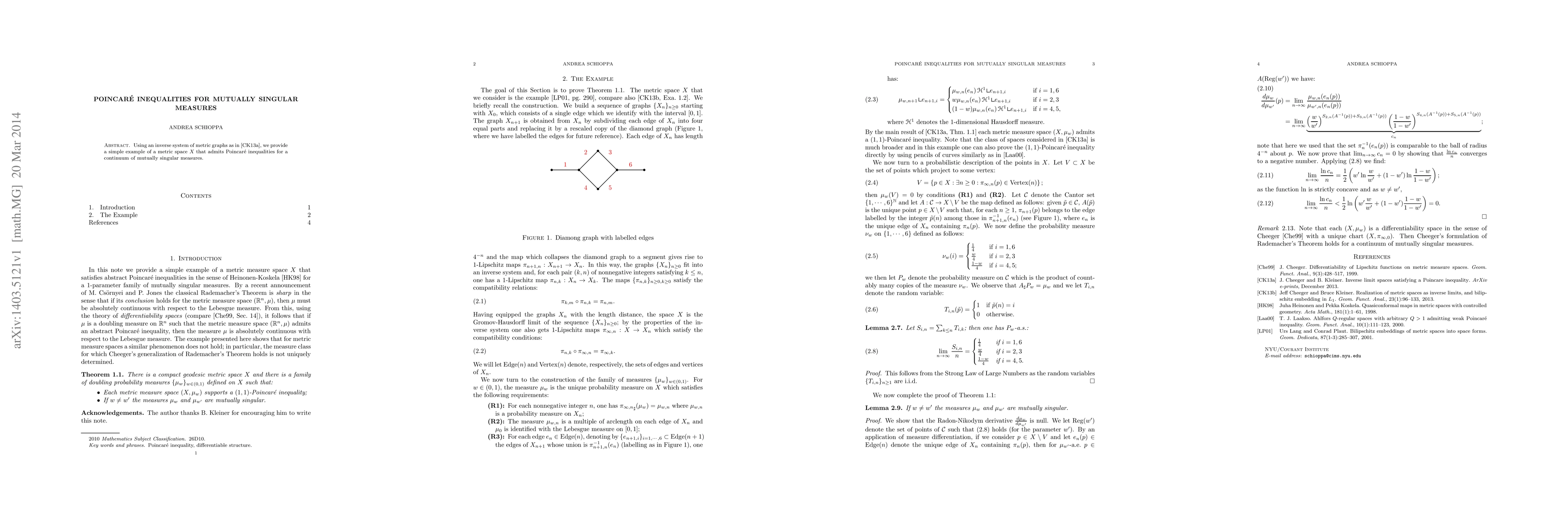 Summary: The paper constructs a metric space $X$ using an inverse system of metric graphs to demonstrate Poincaré inequalities for a continuum of mutually singular measures, extending previous results on singular measures.