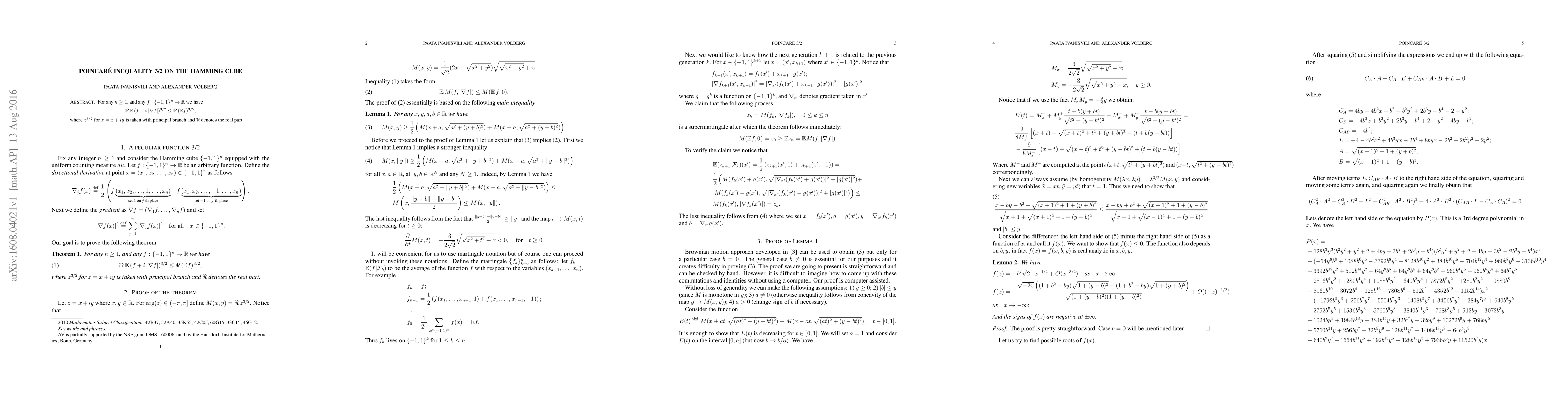 This research paper establishes a Poincaré inequality on the Hamming cube, showing that the real part of the third root of the sum of the square of the gradient magnitude and the function value is bounded by the real part of the square root of the expectation of the function.