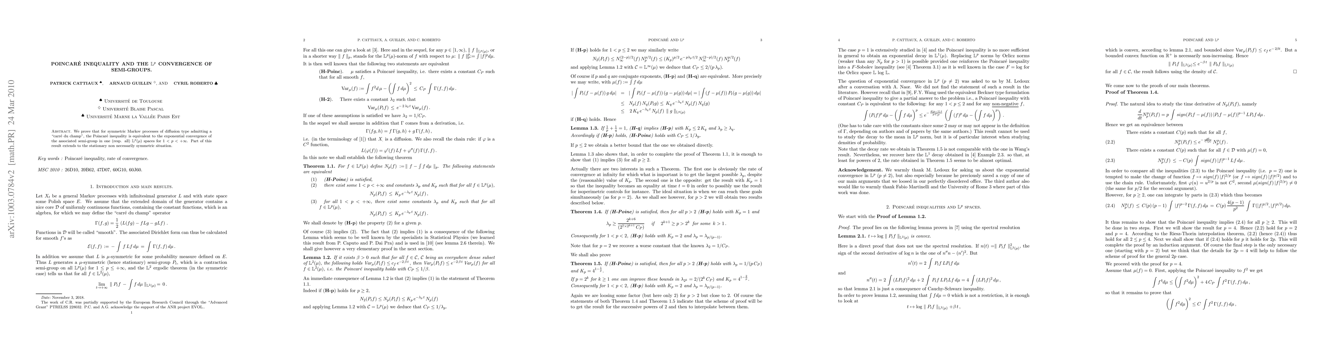 Summary: The paper establishes that for symmetric diffusion-type Markov processes with a "carré du champ," the Poincaré inequality ensures the exponential convergence of the associated semi-group in $\L^p(\mu)$ spaces for $p \in (1, +\infty)$. This result also partially extends to stationary, non-symmetric processes.