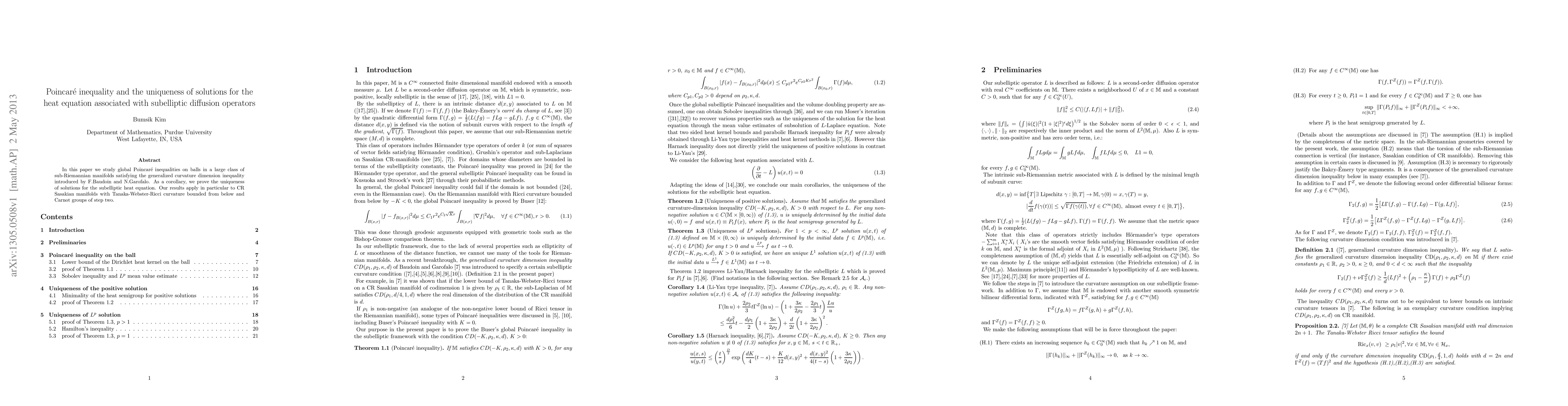 This paper establishes global Poincaré inequalities on sub-Riemannian manifolds, which leads to the uniqueness of solutions for the subelliptic heat equation, applicable to CR Sasakian manifolds and Carnot groups of step two.