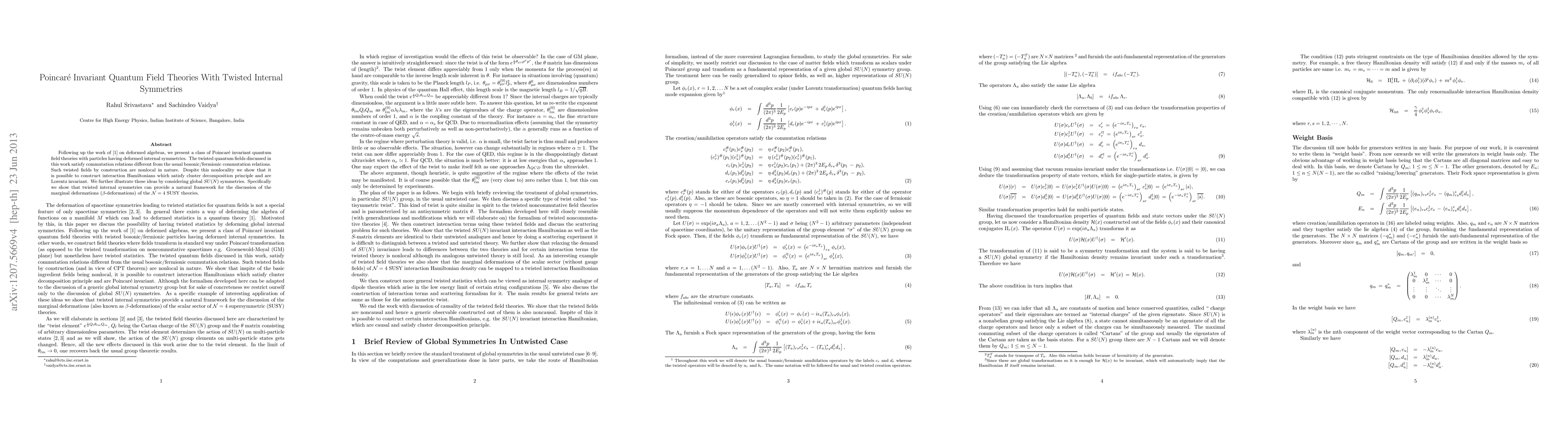 Following up the work of [1] on deformed algebras, we present a class of Poincar\'e invariant quantum field theories with particles having deformed internal symmetries. The twisted quantum fields discussed in this work satisfy commutation relations different from the usual bosonic/fermionic commutation relations. Such twisted fields by construction are nonlocal in nature. Despite this nonlocality we show that it is possible to construct local interaction Hamiltonians which satisfy cluster decomposition principle and are Lorentz invariant. We further illustrate these ideas by considering global SU(N) symmetries. Specifically we show that twisted internal symmetries can significantly simplify the discussion of the marginal deformations (\beta-deformations) of the N=4 SUSY theories.