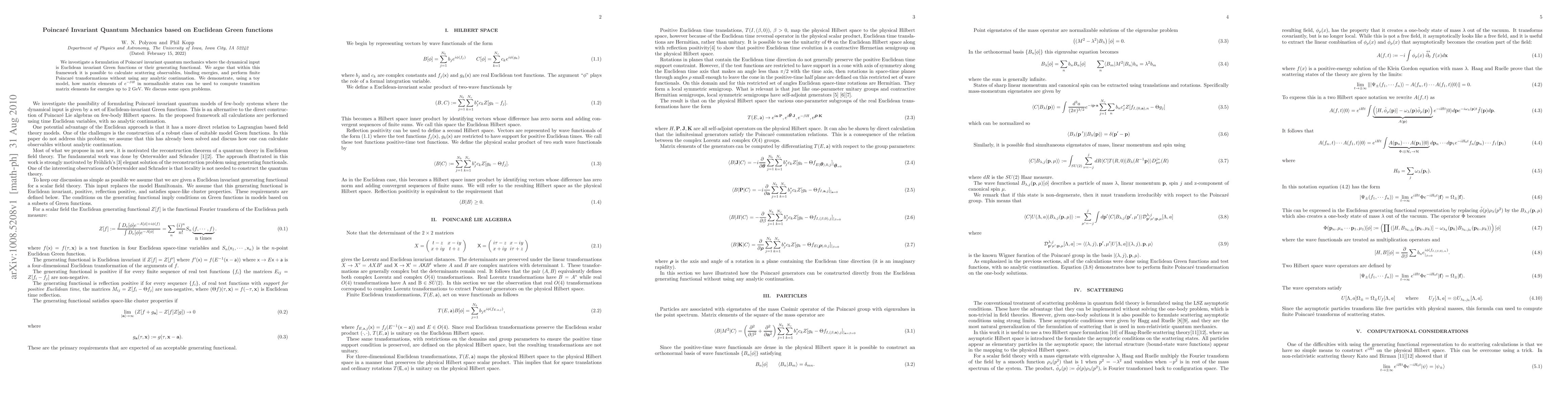 This paper proposes a Poincaré invariant quantum mechanics framework utilizing Euclidean invariant Green functions to calculate scattering observables and binding energies without analytic continuation. It demonstrates feasibility through a toy model, showing how transition matrix elements can be computed for energies up to 2 GeV.