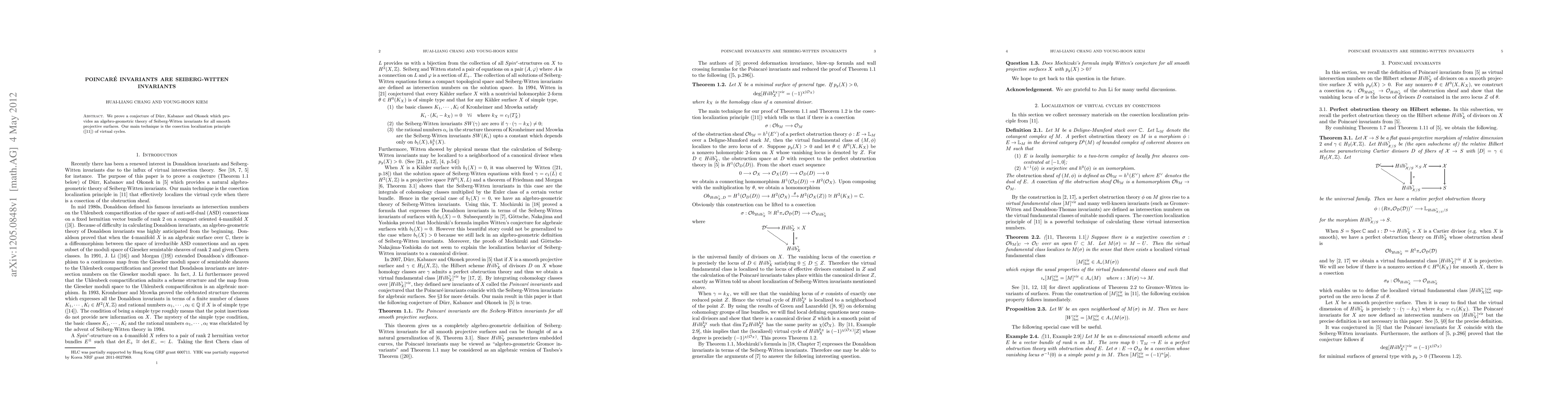 Summary: This paper proves a conjecture linking Poincare invariants to Seiberg-Witten invariants for smooth projective surfaces, utilizing the cosection localization principle for virtual cycles to establish an algebro-geometric theory.