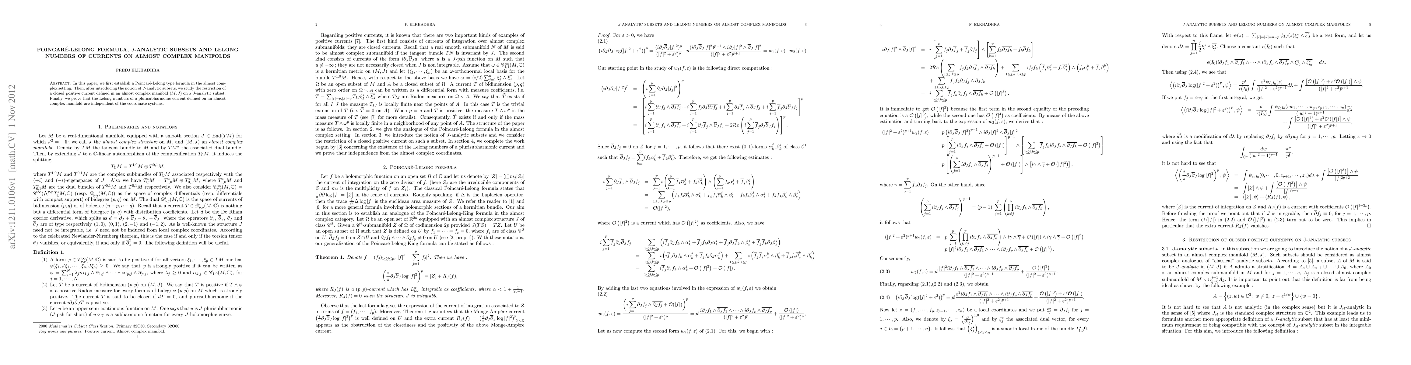 The work extends classical Poincaré-Lelong formulas and Lelong number theory to the almost complex manifold setting, providing new definitions and results that bridge complex and almost complex geometry.