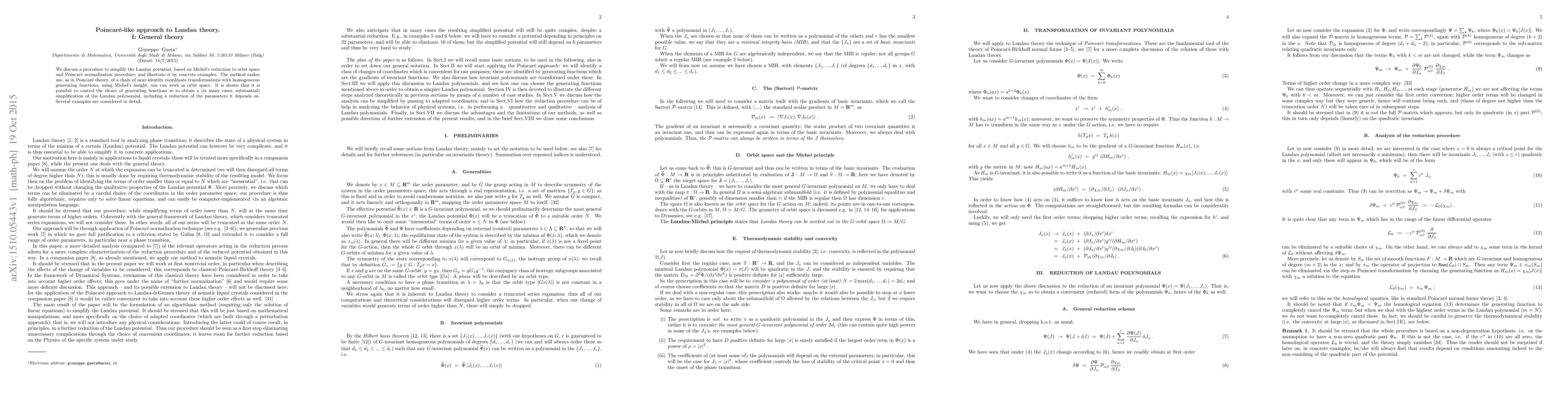 This paper introduces a Poincaré-like approach to simplify the Landau potential using Michel's reduction to orbit space and Poincaré normalization. The method employs near-identity transformations to significantly reduce the complexity of the Landau polynomial and its parameters, illustrated through detailed examples.