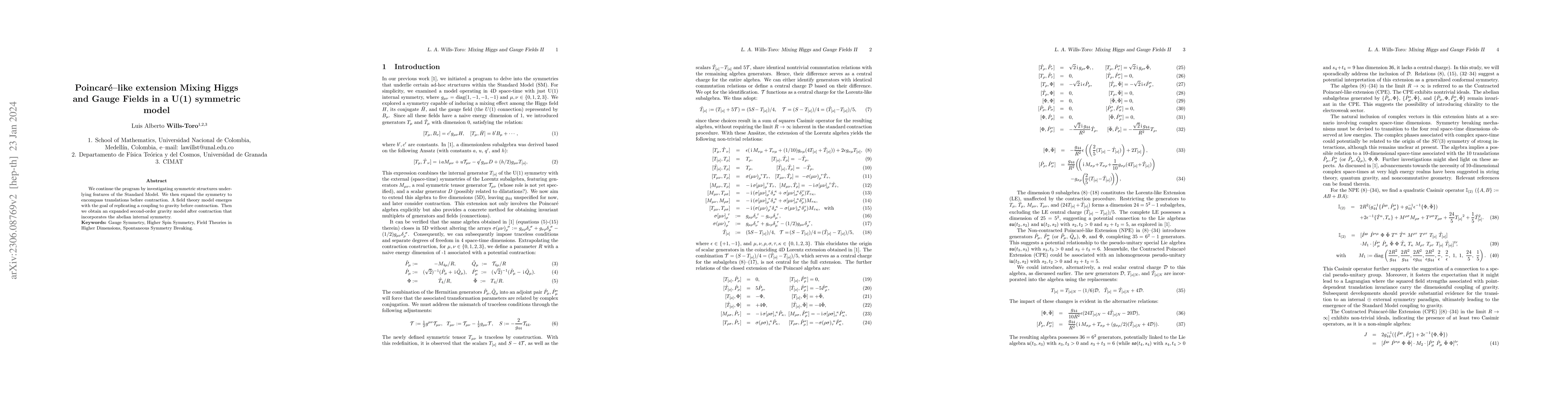 This paper explores a U(1) symmetric model that extends Poincaré-like structures to include mixing between Higgs and gauge fields, aiming to replicate a coupling to gravity before symmetry contraction, resulting in an expanded second-order gravity model with an abelian internal symmetry.