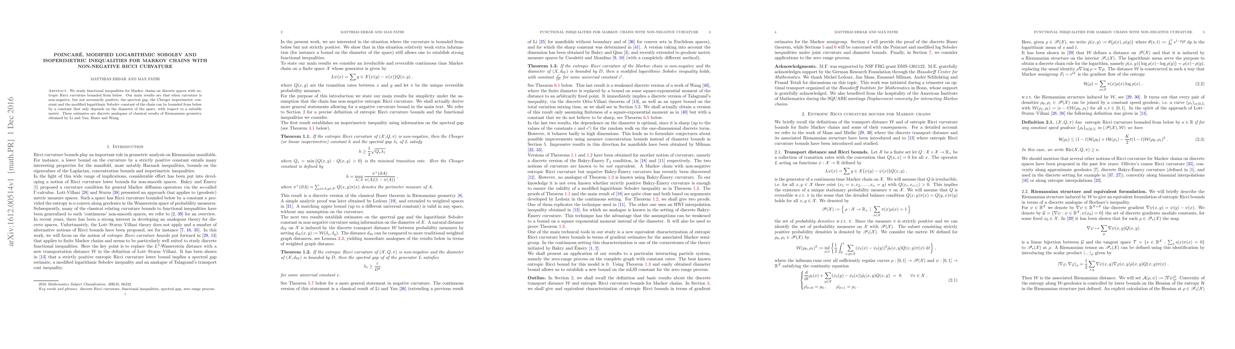 This paper investigates functional inequalities for Markov chains on discrete spaces with non-negative Ricci curvature, showing that under such conditions, the spectral gap, Cheeger isoperimetric constant, and modified logarithmic Sobolev constant can be bounded by a constant dependent only on the space's diameter. These results provide a discrete analogue to classical Riemannian geometry inequalities.