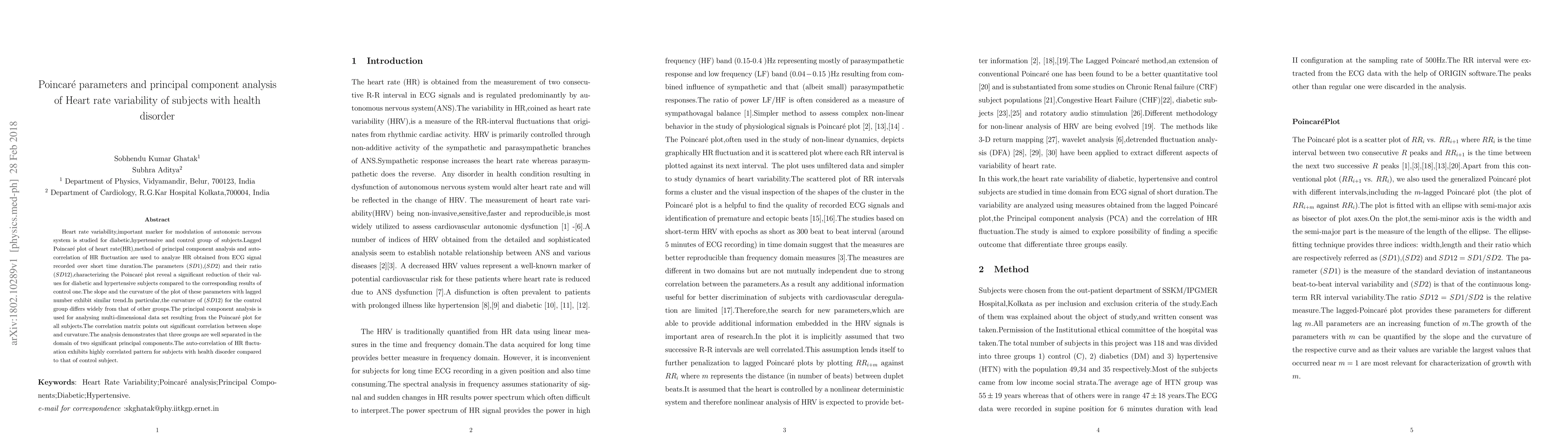 This study analyzes heart rate variability in diabetic, hypertensive, and control groups using Poincaré plot parameters, principal component analysis, and HR fluctuation auto-correlation. The results show significant reductions in Poincaré parameters for diabetic and hypertensive subjects, with the control group showing distinct curvature. PCA reveals clear separation of the groups based on principal components, and auto-correlation indicates stronger HR fluctuation correlation in health-disordered subjects.