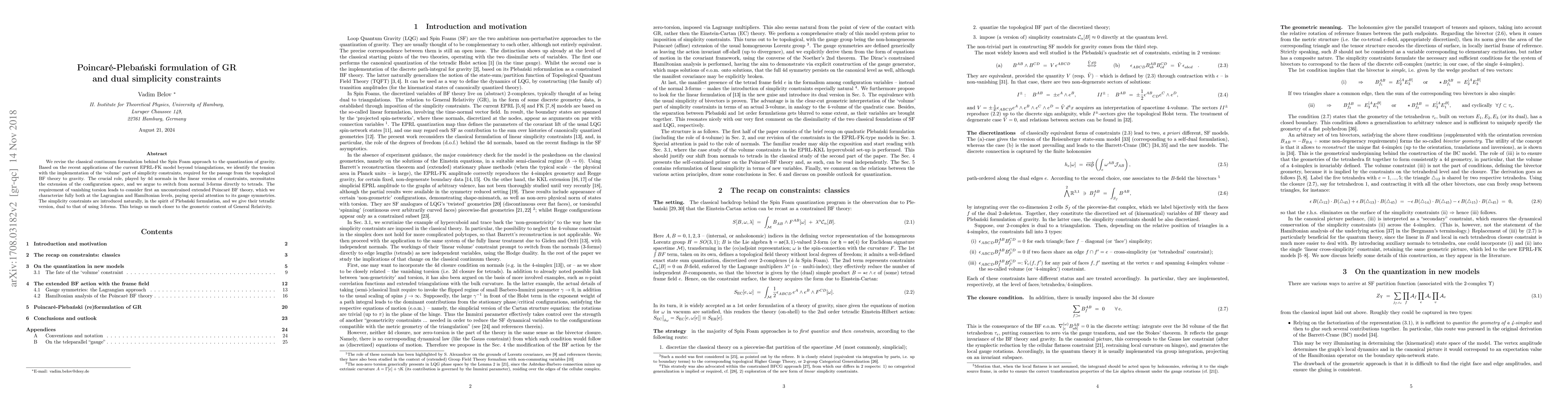 We revise the classical continuum formulation behind the Spin Foam approach to the quantization of gravity. Based on the recent applications of the current EPRL-FK model beyond triangulations, we identify the tension with the implementation of the 'volume' part of simplicity constraints, required for the passage from the topological BF theory to gravity. The crucial role, played by 4d normals in the linear version of constraints, necessitates the extension of the configuration space, and we argue to switch from normal 3-forms directly to tetrads. The requirement of vanishing torsion leads to consider first an unconstrained extended Poincare BF theory, which we characterize fully both at the Lagrangian and Hamiltonian levels, paying special attention to its gauge symmetries. The simplicity constraints are introduced naturally, in the spirit of Plebanski formulation, and we give their tetradic version, dual to that of using 3-forms. This brings us much closer to the geometric content of General Relativity.