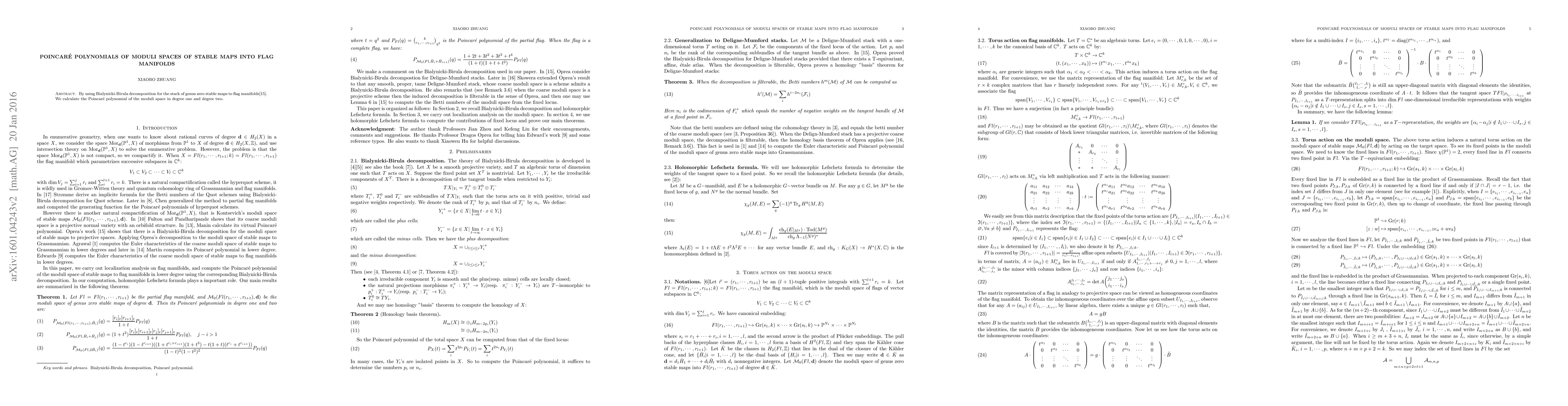 Summary: This paper calculates the Poincaré polynomials for moduli spaces of genus zero stable maps into flag manifolds using Oprea's Bialynicki-Birula decomposition, specifically focusing on degrees one and two. The result provides insights into the topological structure of these moduli spaces.