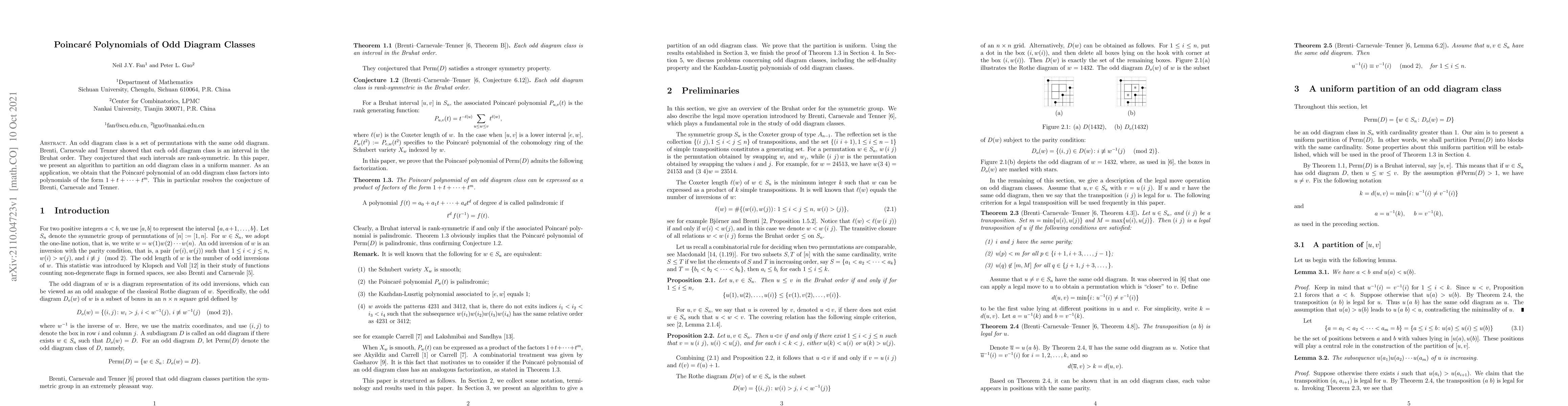 An odd diagram class is a set of permutations with the same odd diagram. Brenti, Carnevale and Tenner showed that each odd diagram class is an interval in the Bruhat order. They conjectured that such intervals are rank-symmetric. In this paper, we present an algorithm to partition an odd diagram class in a uniform manner. As an application, we obtain that the Poincar\'e polynomial of an odd diagram class factors into polynomials of the form $1+t+\cdots+t^m$. This in particular resolves the conjecture of Brenti, Carnevale and Tenner.