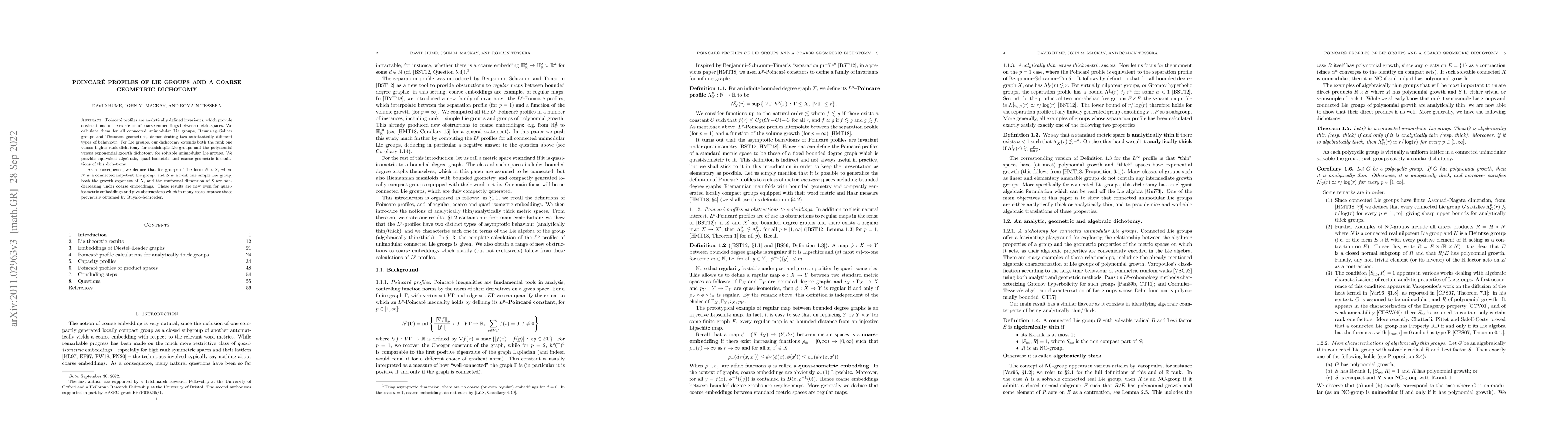 This paper calculates Poincar\'e profiles for connected unimodular Lie groups, Baumslag-Solitar groups, and Thurston geometries, revealing two distinct types of behavior. It establishes a geometric dichotomy for Lie groups that extends existing classifications and provides new insights into coarse embeddings, showing non-decreasing growth and dimension under such embeddings.