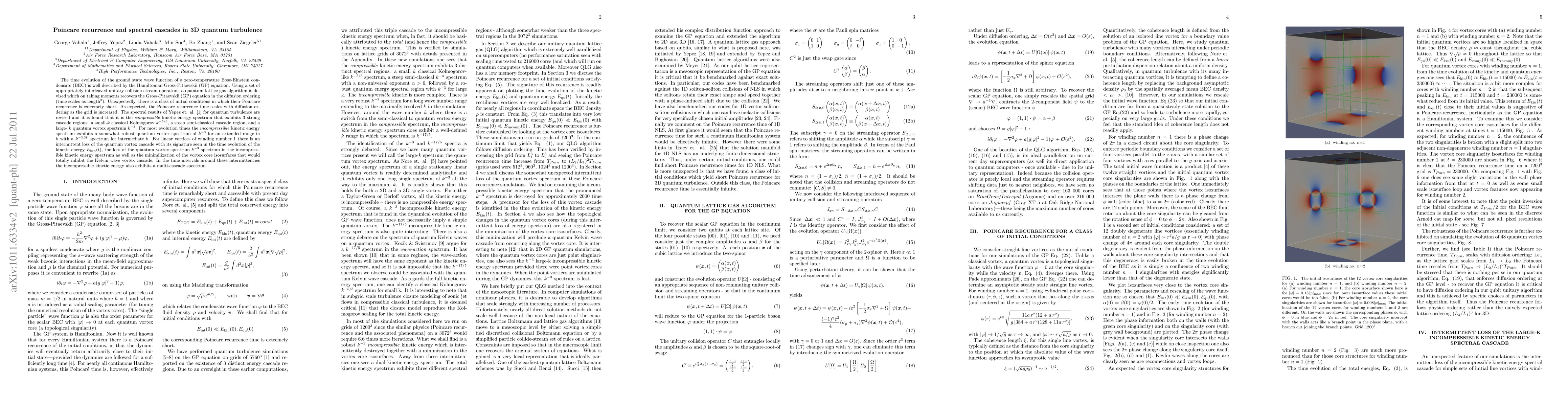 The evolution of the ground state wave function of a zero-temperature Bose-Einstein condensate (BEC) is well described by the Hamiltonian Gross-Pitaevskii (GP) equation. Using a set of appropriately interleaved unitary collision-streaming operators, a quantum lattice gas algorithm is devised which on taking moments recovers the Gross-Pitaevskii (GP) equation in diffusion ordering (time scales as square of length). Unexpectedly, there is a class of initial conditions in which their Poincare recurrence is extremely short. Further it is shown that the Poincare recurrence time scales with diffusion ordering as the the grid is increased. The spectral results of Yepez et.al. [1] for quantum turbulence are corrected and it is found that it is the compressible kinetic energy spectrum that exhibits the 3 cascade regions: a small k classical Kolmogorov k^(-5/3) spectrum, a steep semi-classical cascade region, and a large k quantum Kelvin wave cascade k^(-3) spectrum. The incompressible kinetic energy spectrum exhibits basically a single cascade power law of k^(-3). For winding number 1 linear vortices it is also shown that there is an intermittent loss of Kelvin wave cascade with its signature seen in the time evolution of the kinetic energy, the loss of the k^(-3) spectrum in the incompressible kinetic energy spectrum as well as the minimization of the vortex core isosurfaces that inhibits the Kelvin wave cascade.