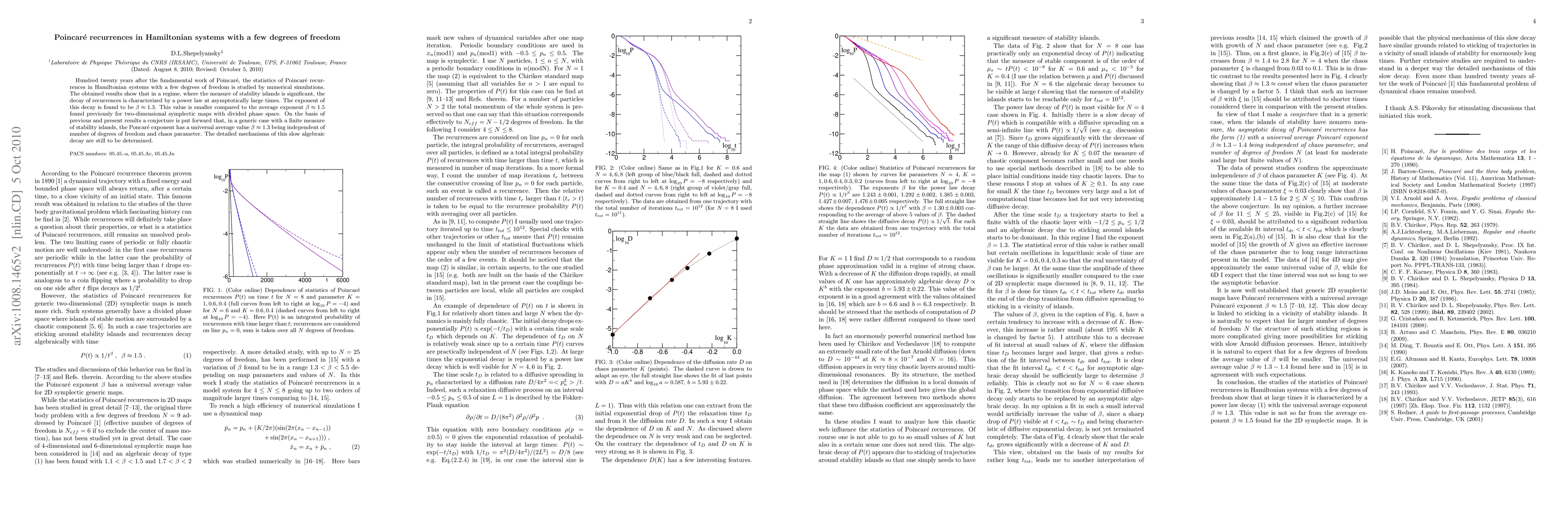 Hundred twenty years after the fundamental work of Poincar\'e, the statistics of Poincar\'e recurrences in Hamiltonian systems with a few degrees of freedom is studied by numerical simulations. The obtained results show that in a regime, where the measure of stability islands is significant, the decay of recurrences is characterized by a power law at asymptotically large times. The exponent of this decay is found to be $\beta \approx 1.3$. This value is smaller compared to the average exponent $\beta \approx 1.5$ found previously for two-dimensional symplectic maps with divided phase space. On the basis of previous and present results a conjecture is put forward that, in a generic case with a finite measure of stability islands, the Poncar\'e exponent has a universal average value $\beta \approx 1.3$ being independent of number of degrees of freedom and chaos parameter. The detailed mechanisms of this slow algebraic decay are still to be determined.