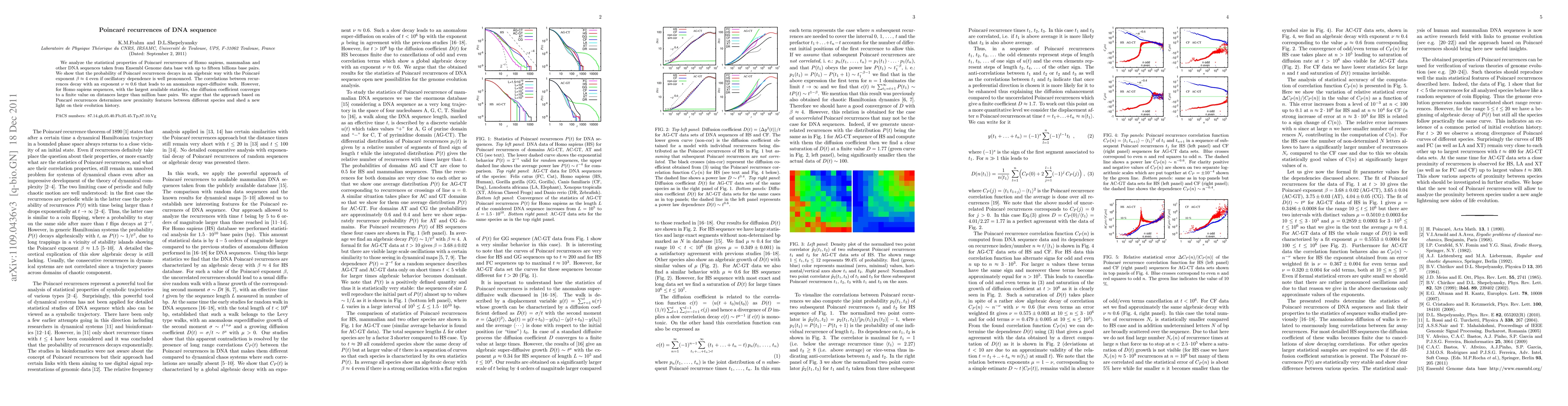 This paper investigates the statistical properties of Poincaré recurrences in DNA sequences from various species, revealing an algebraic decay in recurrence probability with a Poincare exponent of approximately 4. It also finds that correlations between recurrences decay with an exponent of around 0.6, leading to anomalous super-diffusive behavior, though the diffusion coefficient stabilizes for large distances in Homo sapiens sequences.