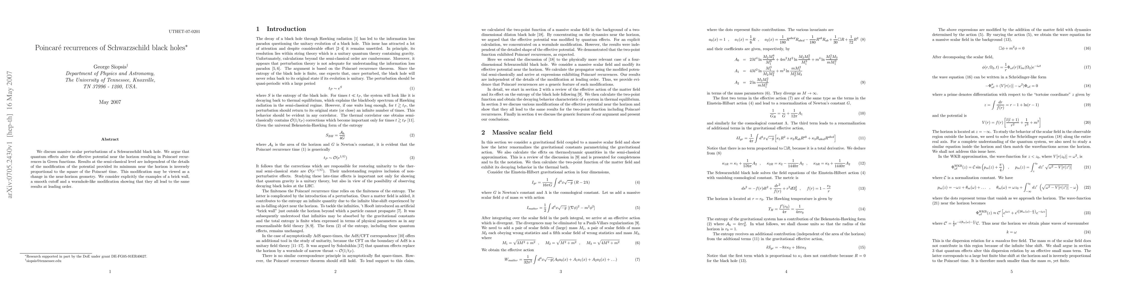 We discuss massive scalar perturbations of a Schwarzschild black hole. We argue that quantum effects alter the effective potential near the horizon resulting in Poincare recurrences in Green functions. Results at the semi-classical level are independent of the details of the modification of the potential provided its minimum near the horizon is inversely proportional to the square of the Poincare time. This modification may be viewed as a change in the near-horizon geometry. We consider explicitly the examples of a brick wall, a smooth cutoff and a wormhole-like modification showing that they all lead to the same results at leading order.