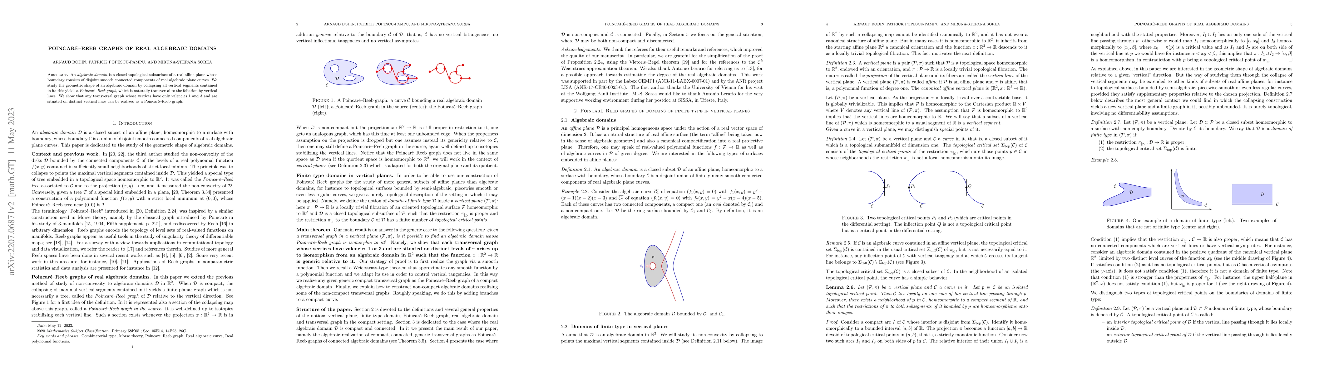 The paper studies the geometric shape of algebraic domains by collapsing vertical segments contained within them, resulting in Poincaré-Reeb graphs. It demonstrates that any transversal graph with specified vertex valencies and distinct vertical lines can be realized as a Poincaré-Reeb graph.